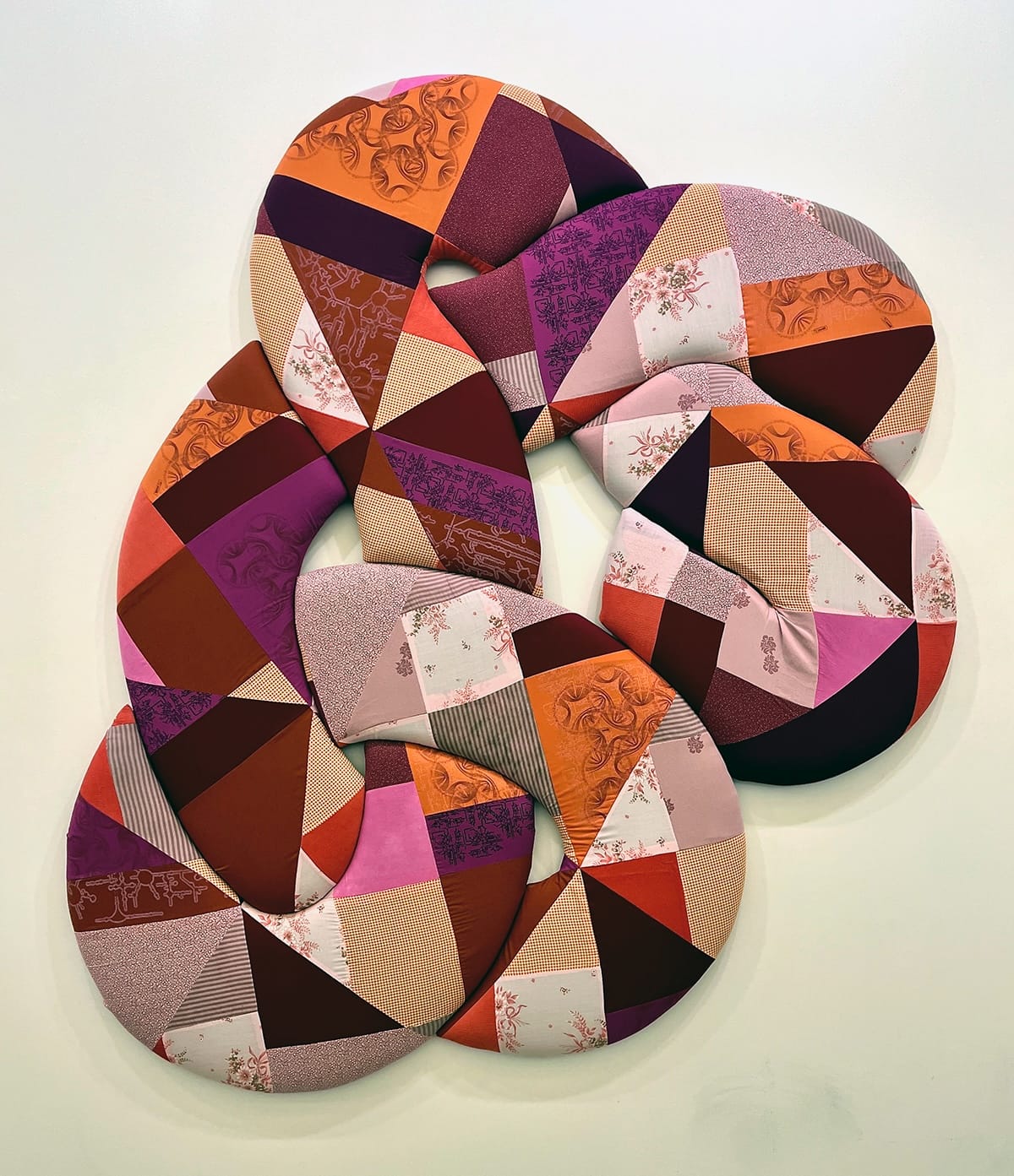 “Anatomy of a Bond" is composed of quilted panels made from found and screen-printed fabric in a warm color palette that includes deep red, bubblegum pinks, and tangerine-peel orange. Ausherman screen-printed some of the darker, more saturated fabrics with patterns that allude to networks — maybe human-made, maybe the kind instinctively formed between root systems. These contrast with patterned, traditionally feminine panels made from what appear to be vintage materials. It may be closed-off and alone, but this system signals for connection in more than one way. The knot of “Anatomy of a Bond” is slightly cocked to one side, almost corporeal.