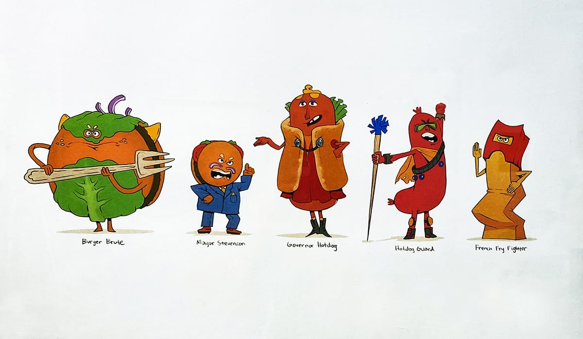 Works by Thomas Giebler, from left: “Food Fight Character Concepts,” digital illustration, 11 by 17 inches; “Various Popcorn Tin Illustrations,” digital illustration, 24 by 35 inches each. Photos by Lori Brack for the SHOUT