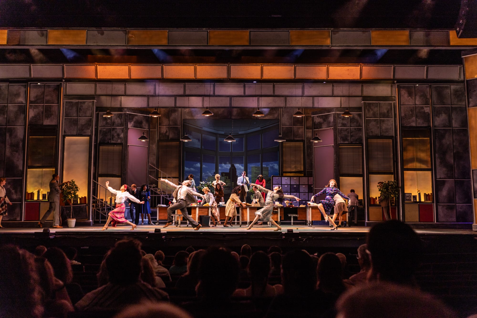 Scenic designer Robert A. Kovach provides us with beautiful interior paint jobs and effective moving furniture pieces, but the big reveal after a front-of-curtain scene rarely impresses. The program doesn’t note a specific projection designer, but here they serve one or two legitimate functions and then fill up empty space and often distract. Costumes, designed by Shannon Smith-Regnier, set the era without commenting on it, as do Kaite Crandall’s hair and makeup. They both have their fun during the more imaginative musical numbers, but I didn’t realize how distracting Doralee’s act one wig was until the beginning of Act 2 when she re-enters in a much-improved look. The biggest spectacle of the show, however, is easily the choreography. The youthful ensemble is a delight to watch. Sciotto’s choreography owes a tip of the cap to legend Michael Kidd, whose original dance brought a strong, grounded feel to the largely ballet-influenced style. This is the only place in Wichita where you will see as many musical theater dancers of this caliber on the same stage, and it’s a joy to watch.