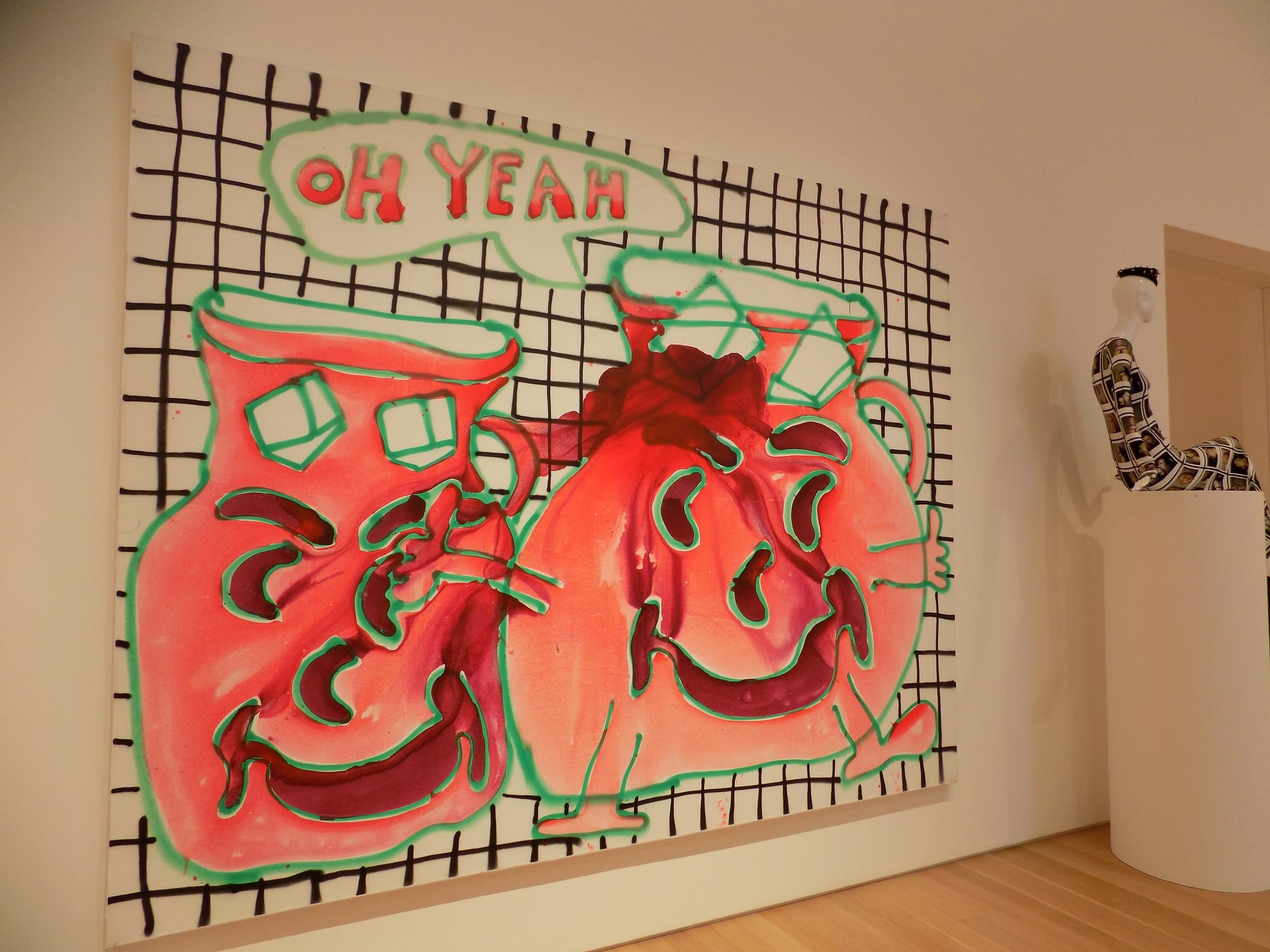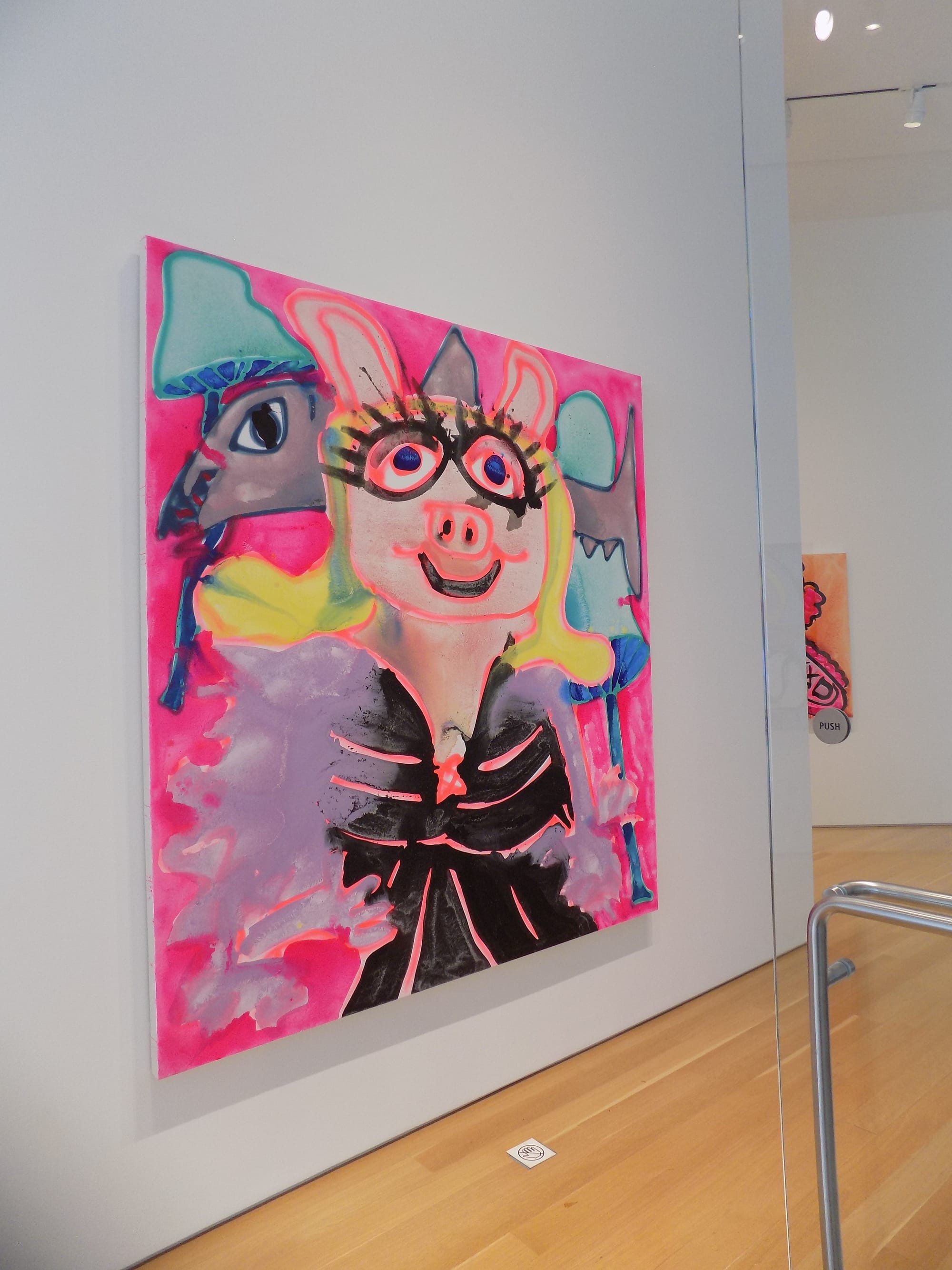 A procession of mannequins donned in Jeremy Scott's garments cheerfully greets visitors as they walk through the front entrance, Katherine Bernhardt's paintings trickle into the cafe area and give them something to look at as they wait for the elevator. “A Match Made in Heaven” overwhelms the Nerman Museum of Contemporary at in Overland Park, taking over several galleries on the first and second floors. The expressive paintings of Katherine Bernhardt alongside cheeky textile works by Jeremy Scott march in lockstep on the floor and walls of each space. Both artists have erratic but distinct and vibrant styles and make frequent tongue-in-cheek pop-cultural references. The exhibition's sharp tone might even provoke an audible laugh.