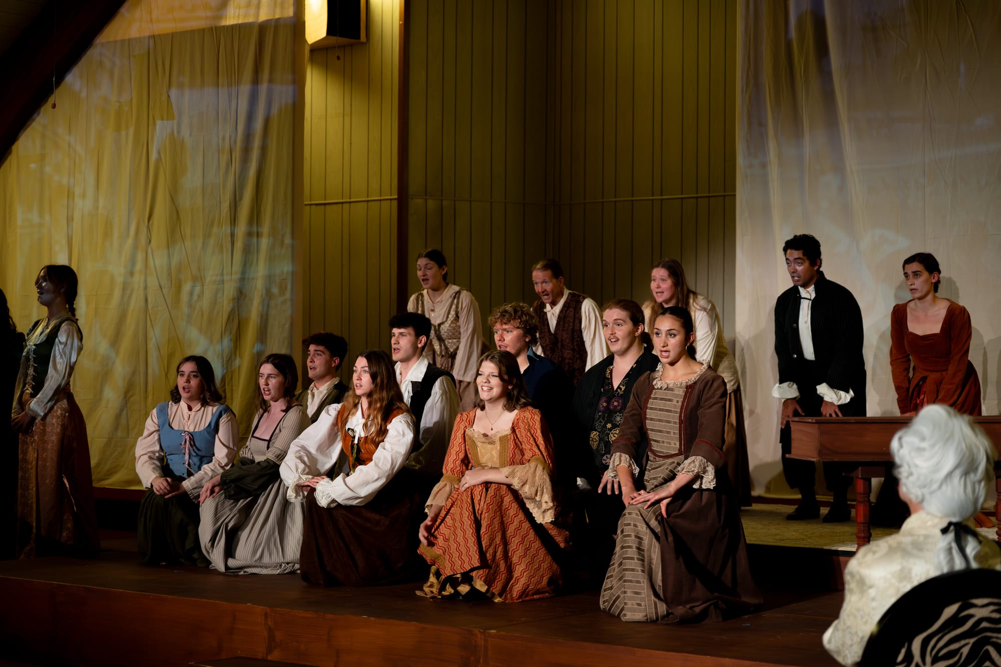 The acoustics are lovely, a wonderful thing given that another fine element of this production is the addition of musical arrangements composed by Dr. Judith Lynn Stillman and executed by members of the marvelous Wichita State University Opera Theater ensemble, led by Music Director Alan Held with Warren Kim playing piano. While the original version of the play does not include choral works, Stillman’s arrangements are sometimes included when companies have access to partnership with a talented choral group, as is the case here.