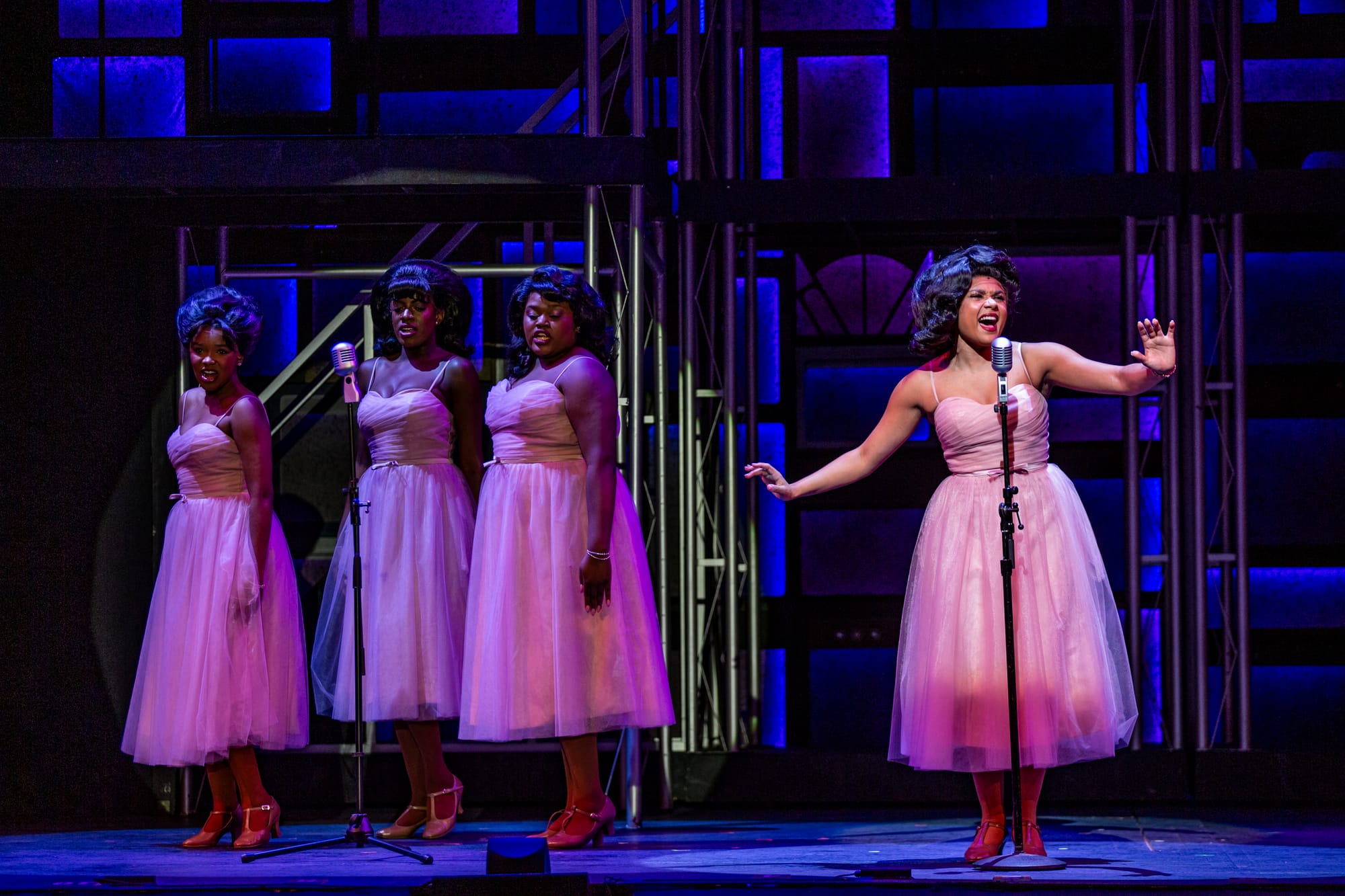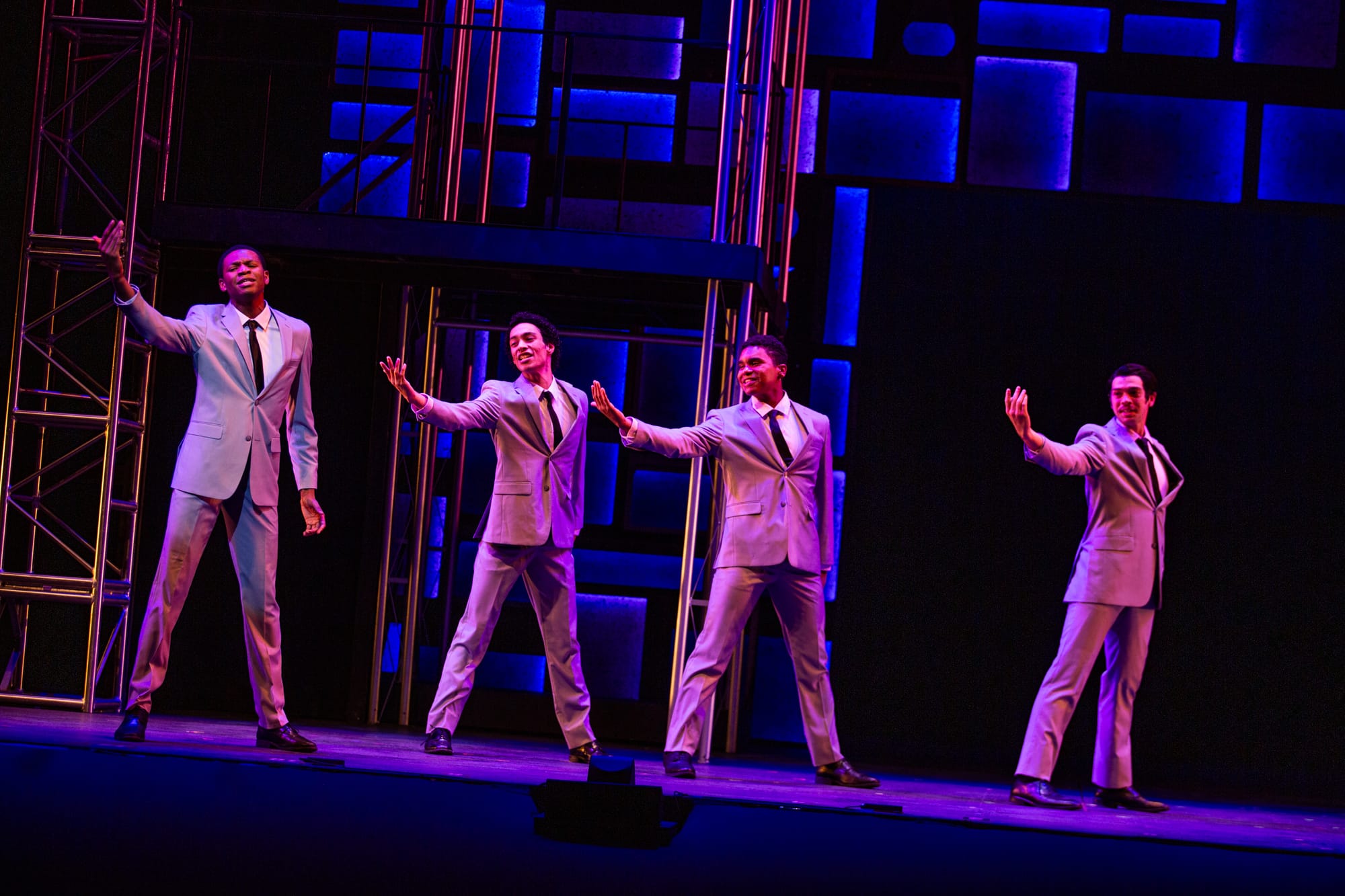 The Drifters (Marcus Byers Jr., Jaden Kindle, Jonah Taylor and Evan Vaughn) and The Shirelles (Rayna J., Aria Evans, Alanna Porter and Indya Lincicome) are two of the famous acts portrayed by members of the MTW ensemble. Courtesy photos by Kacy Meinecke
