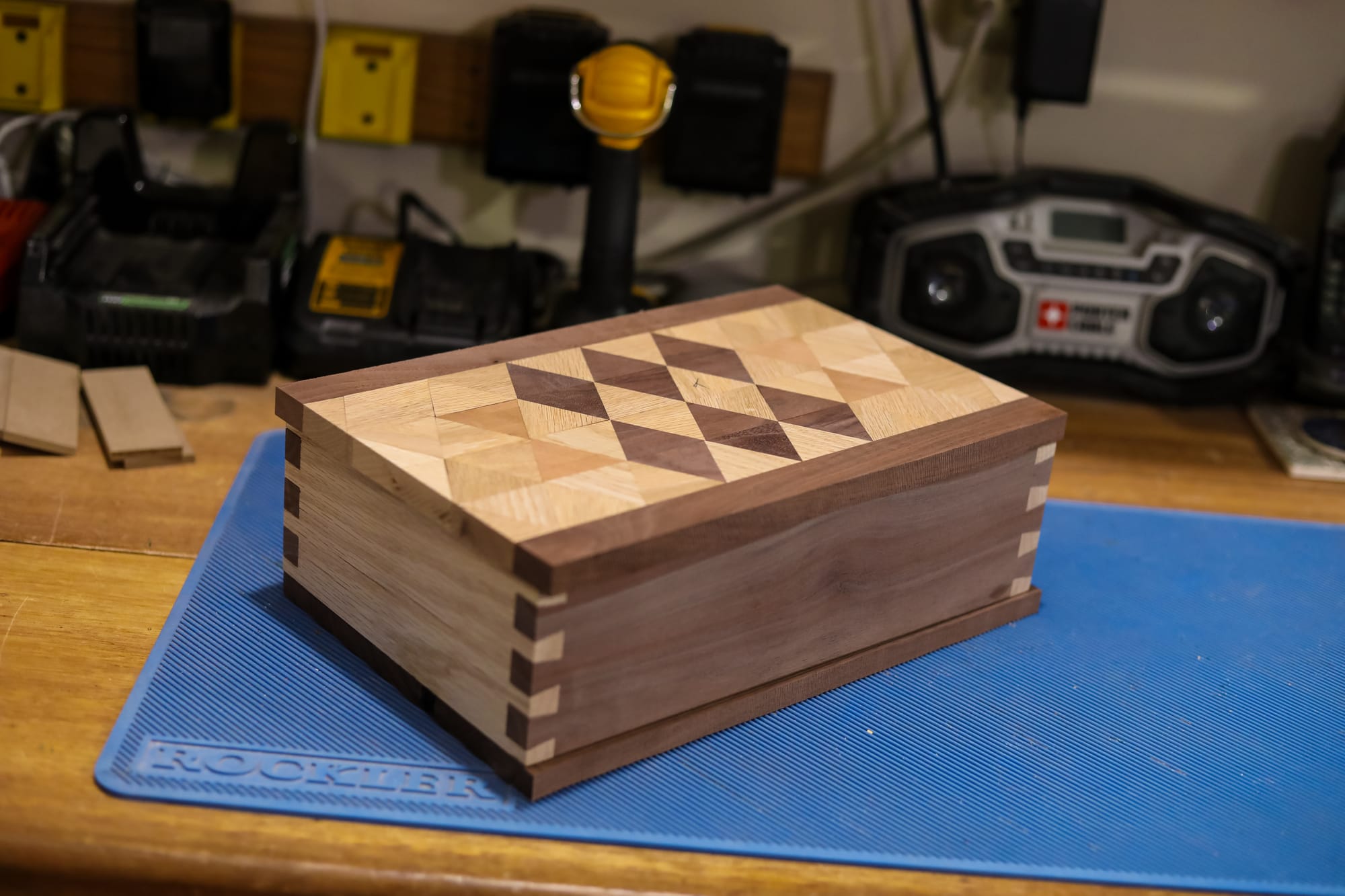 I met Bill on the day my father picked up mom’s jewelry box/would-be urn. The two of us drove together, north from Wichita and into Salina. My mom’s headaches and weakness from infusions kept her from joining us. For the last month, my father and Bill collaborated over how my mother’s jewelry box would look. They picked the woods (walnut and oak), and they went back-and-forth on the quilt-pattern design on the front. The mood in the car was light, and the sun was shining north of Hesston despite having been overcast with thick fog along Highway 135. We had the wind at our back.