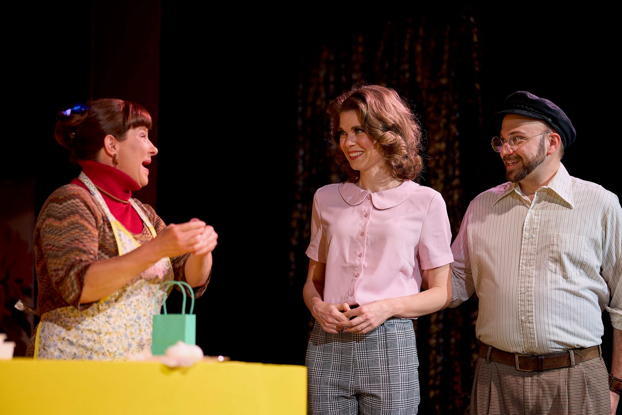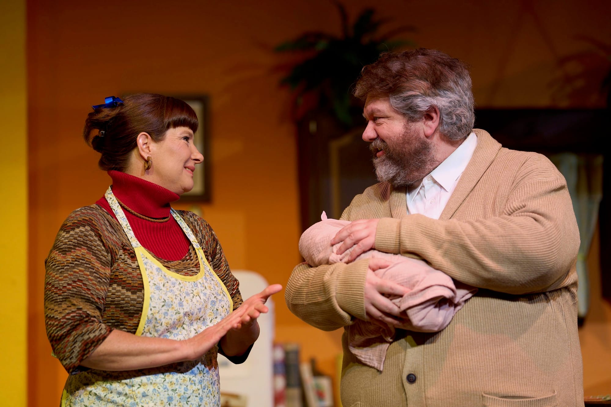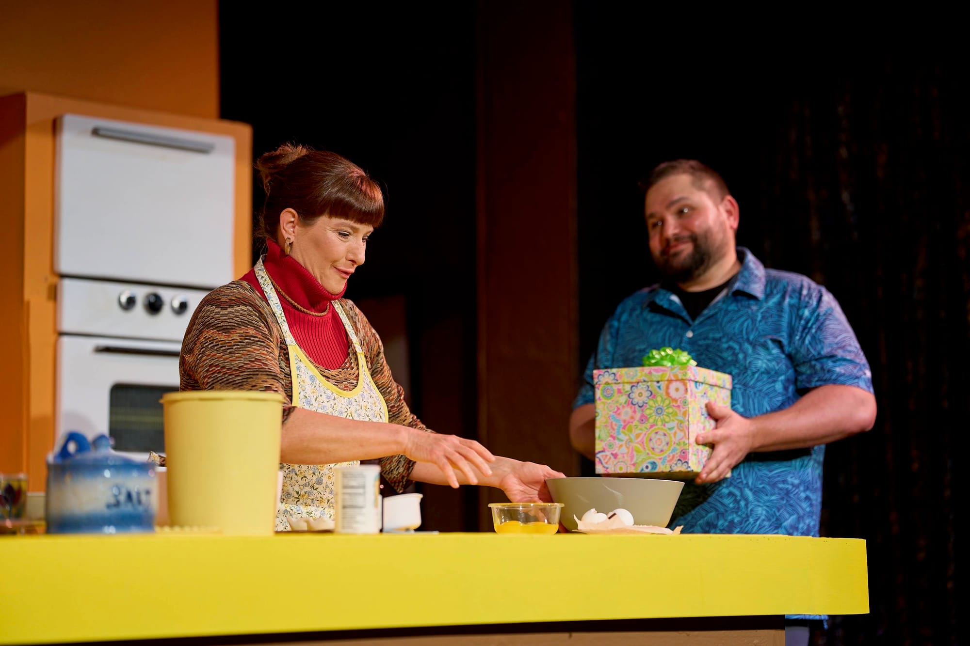 Along with characterization, costuming and set additions add visual cues for the audience. Ernestine gains a growing number of accessories and additions around her kitchen that show the passage of time.