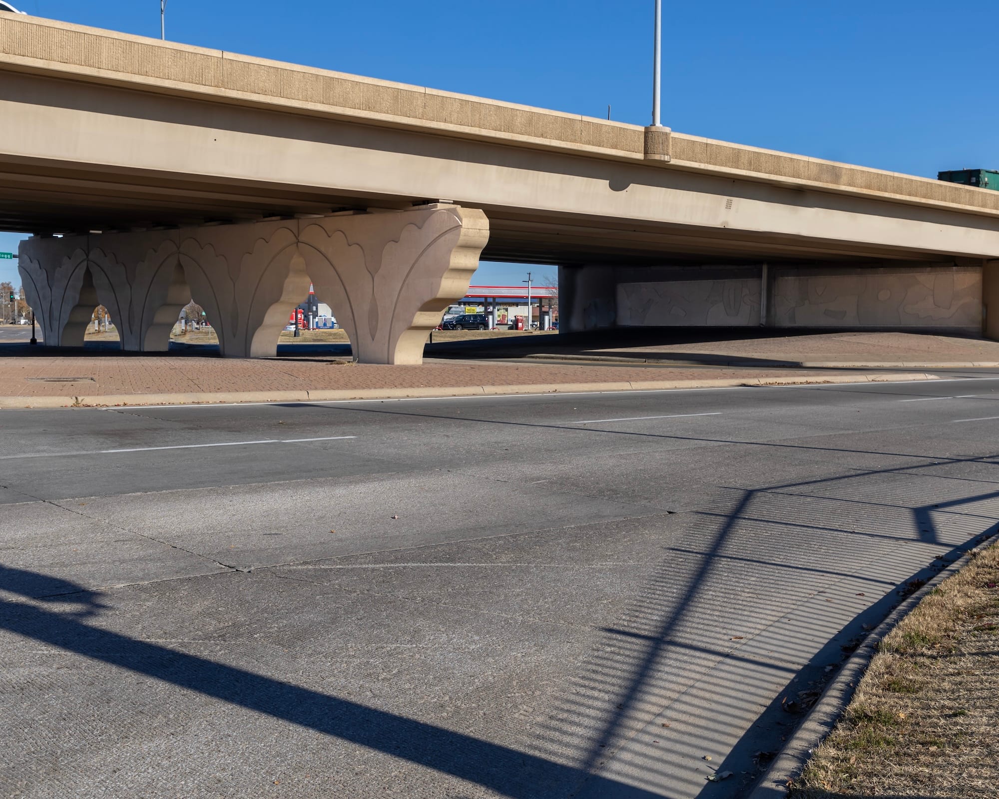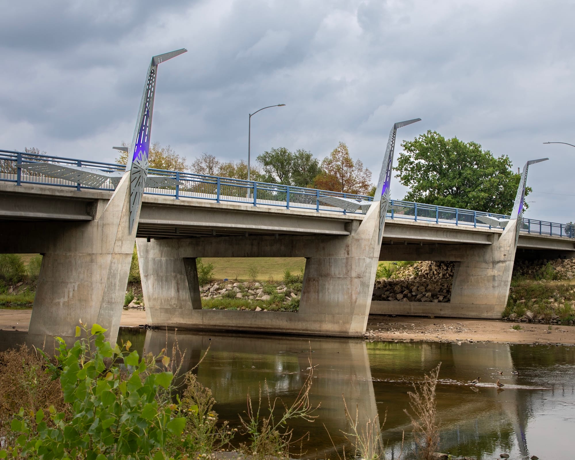Many works in Wichita's public art collection are integrated into infrastructure, such as "Red Water at Sunset (Minisa Bridge)" (Bruce Moore and Ethel Parker, concrete, 1932) and the more recent "Harry Street Bridge Cranes (Stephen Atwood and Kent Williams, stainless steel, 2021) and "Leaf Piers and Retaining Walls" (Dan Gegan, concrete). Photos courtesy of the City of Wichita.