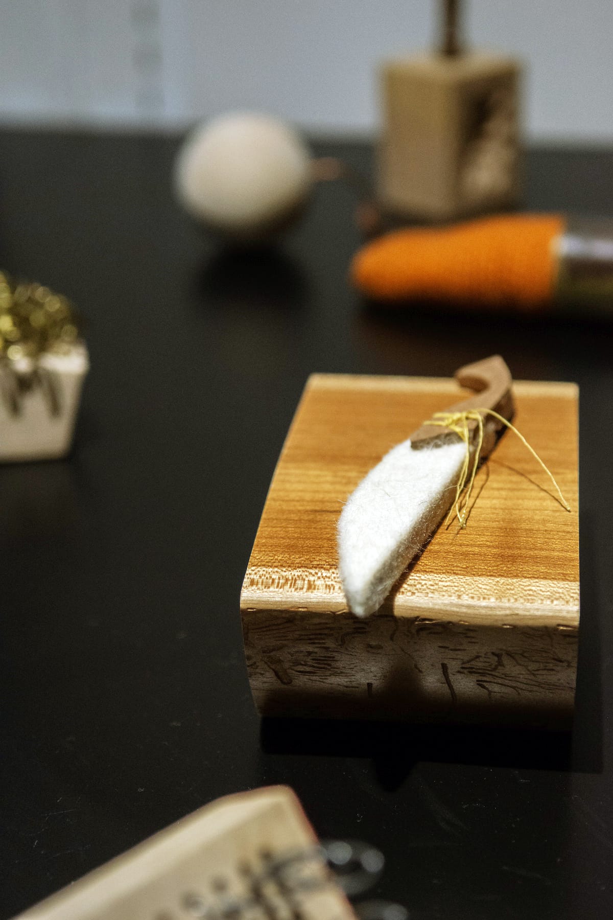 With these objects, the artist offers up care and ensures that no one will get a splinter or run a hand over a sharp edge. “Objects for Tending,” for instance, includes a knife with a blade made of felt. Ensuring that visitors have a good experience is baked into these pieces. The experience is intimate — an audience of one, you and the work, which fits in your hand. The various components would fit comfortably in a kitchen drawer. I imagined them arranged next to a fur-lined teacup.