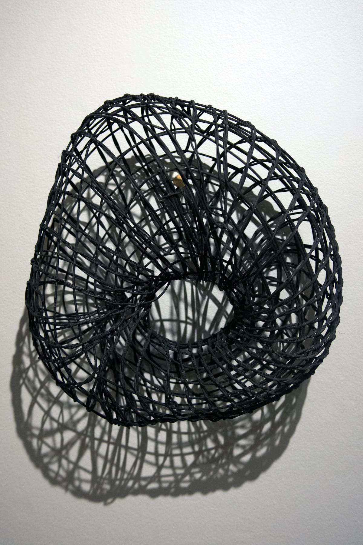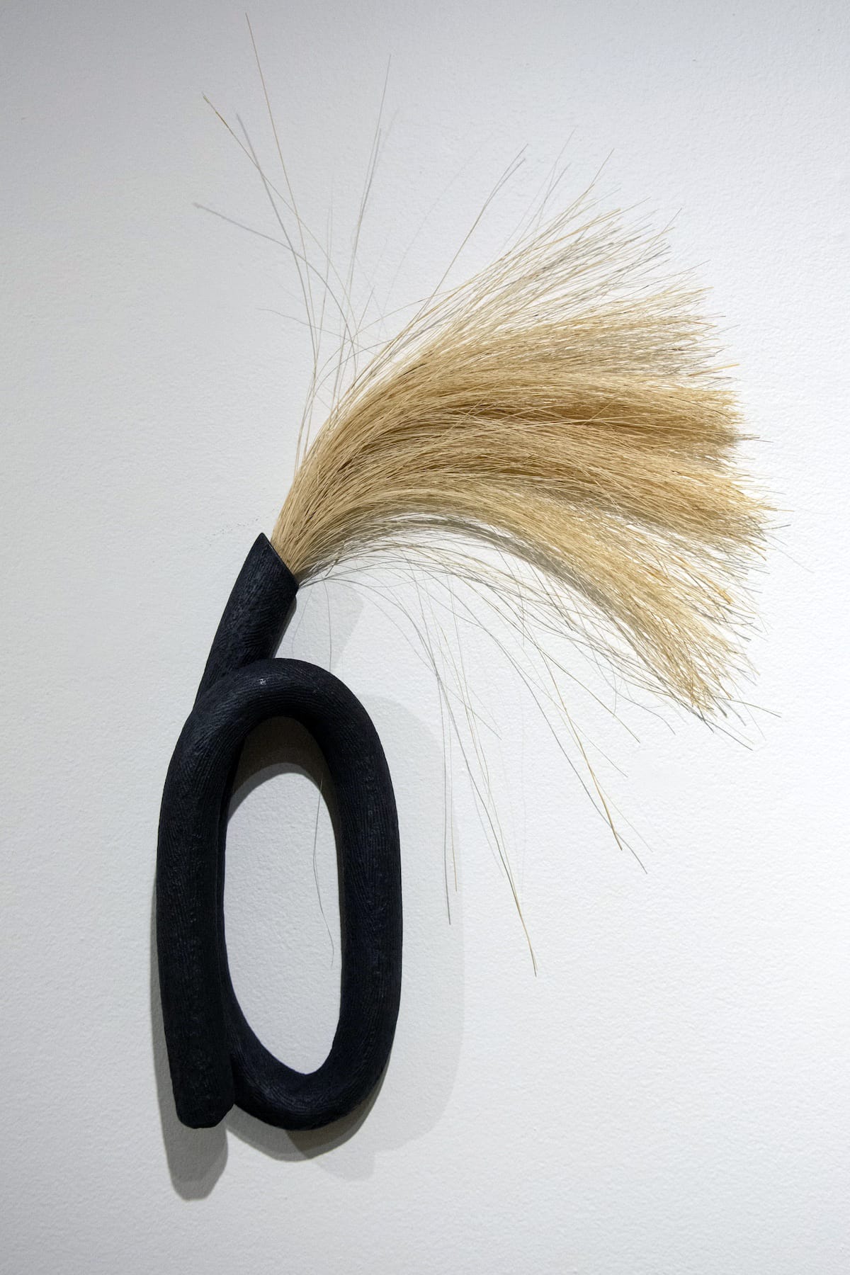 The wall-mounted “Lineation” pieces mentioned earlier, the most formal of her offerings, look as if they have been captured mid-twist-and-turn — frozen in a moment of becoming. Combining ceramic, reed, iron, steel, reeds and Tampico — a plant fiber made from yucca plants — Kleckner maintains the identity and integrity of each material and metamorphoses them to make a new thing that is singular and whole. Scattered across the gallery wall, they roll down and then back up a landscape with no horizon. The dramatic shadows thrown by “Lineation 5” — interlocking circles of bound reeds and ceramic coils blackened with graphite that protrude from the wall — give the illusion of deeper space and grow the footprint of a relatively small, compact sculpture.