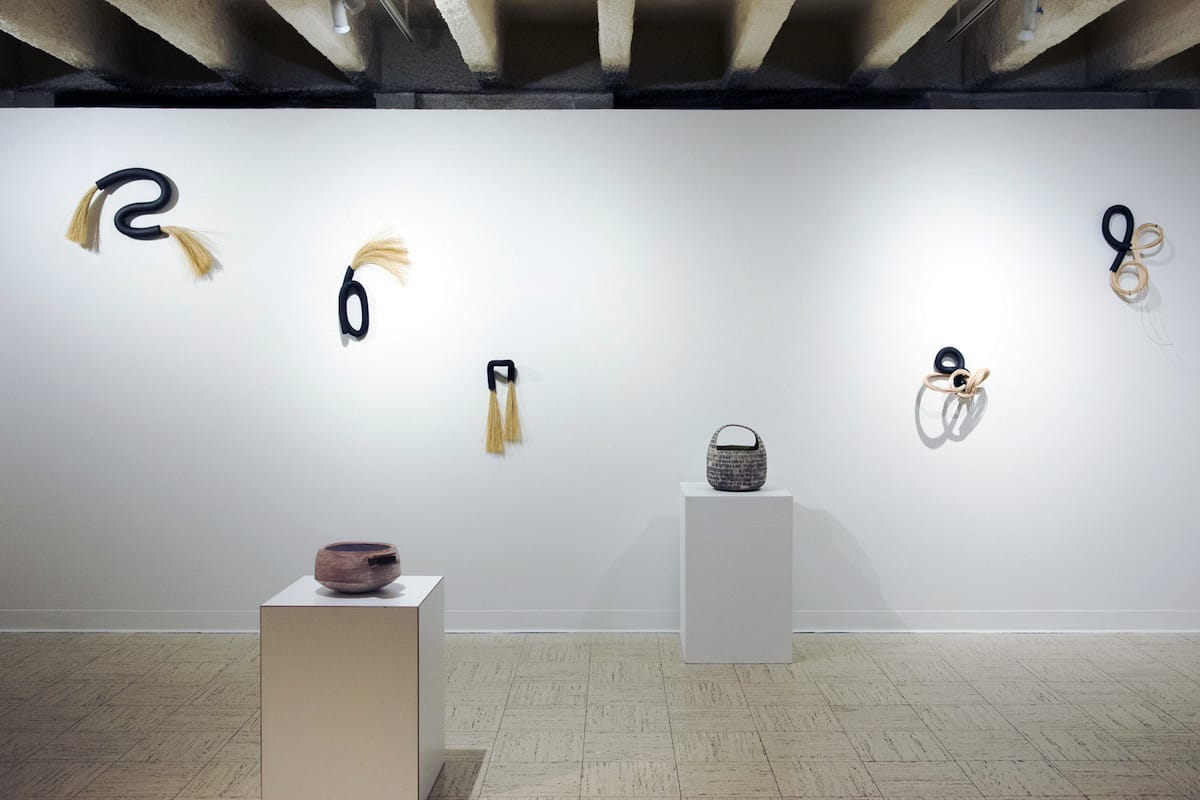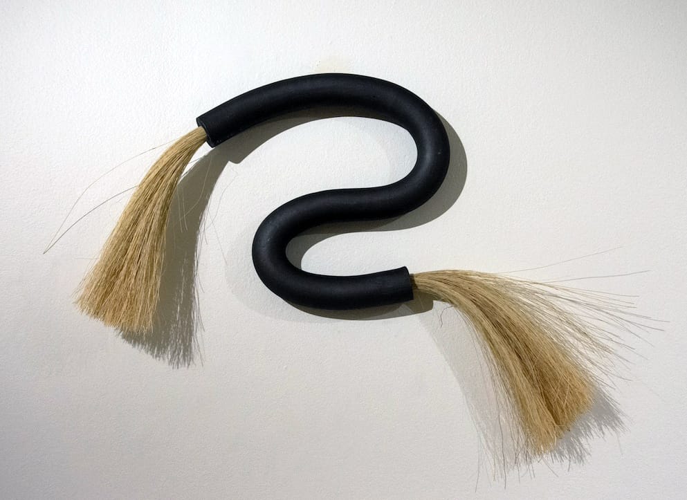 This dance is implied in the exhibition’s installation. With an aversion to symmetry, pieces like the “Lineation” series — curving tubes of ceramic and graphite with Tampico plant fibers emerging from the ends like the ponytails — undulate across the wall. The arrangement mimics the sight line observed in bird flight rather than the grid-based geometry of most gallery spaces.