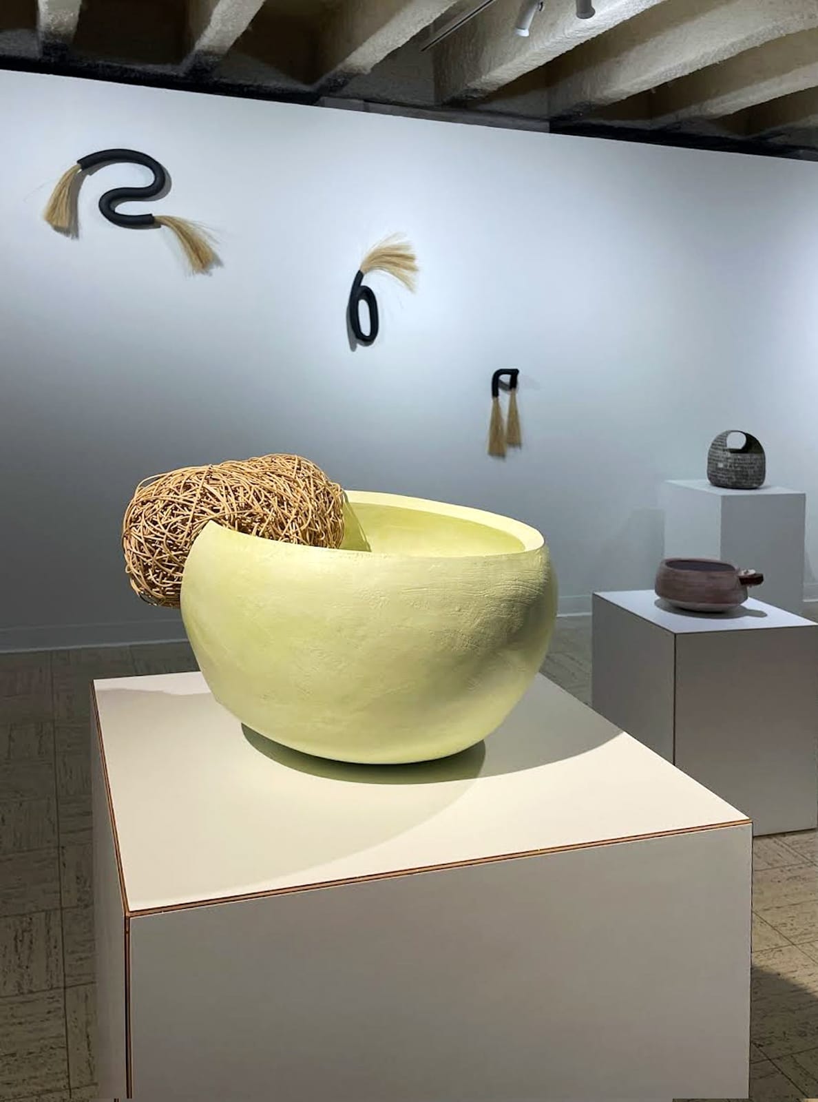 Kleckner places some sculptures on pedestals no higher than two feet tall. “Mazor,” a stoneware bowl, sits on one of the low pedestals, allowing viewers to investigate its ramen-looking reed growth with ease. She mounts other wall works, such as “Green Circle” — a looped reed wreath with a mossy green ceramic grip — lower than three feet from the floor. Across the length of the exhibition space, the point of view switches from a human’s eye level to bird’s eye several times. What is a top view for most adults is eye level for a child or anyone experiencing the art from a chair and, overall, the presentation defies the expectation that a gallery visitor is any one type of person. Human connection is the common denominator of the exhibition experience.
