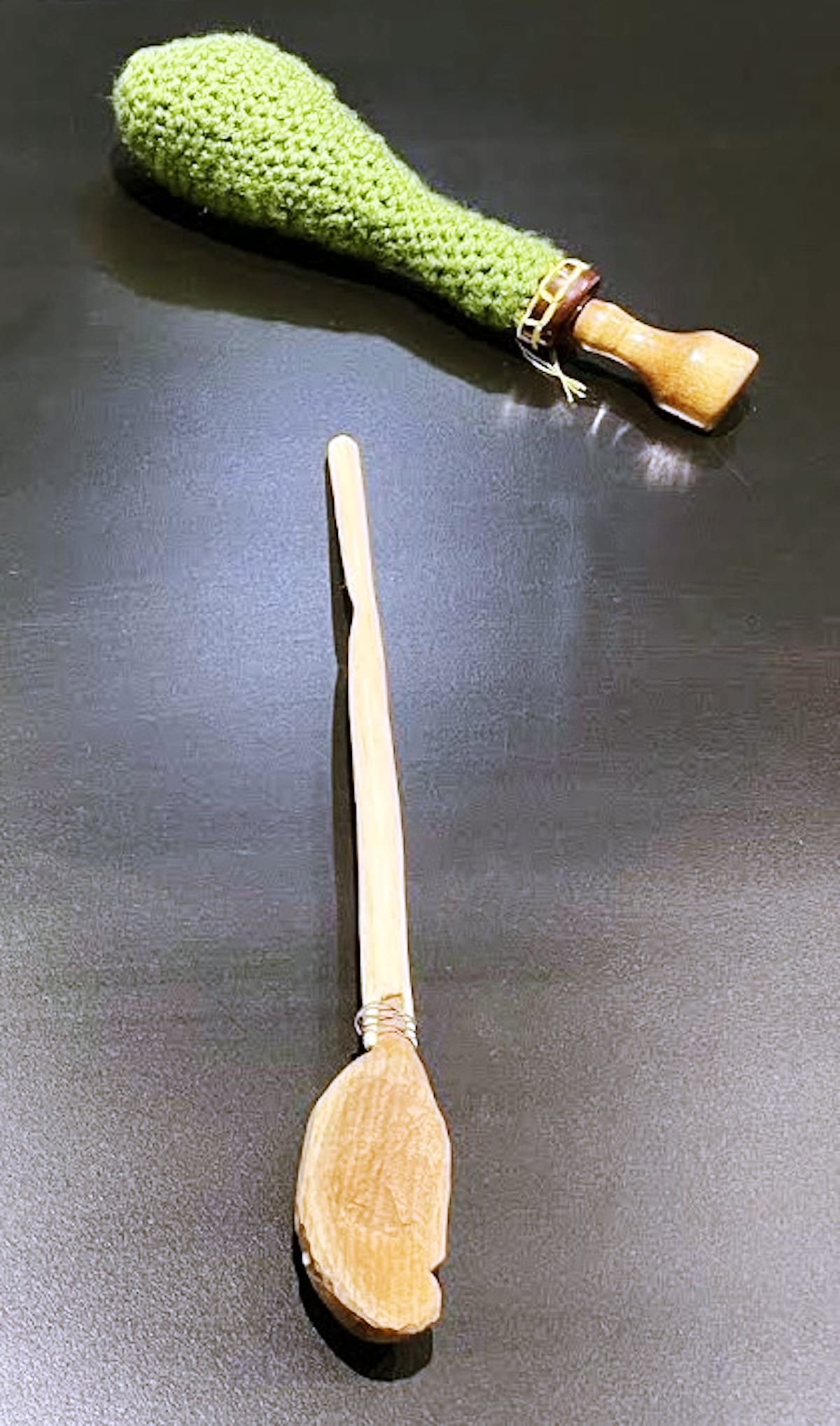 Kleckner studied ceramics at Ohio University, the University of Nebraska Lincoln, and the Appalachian Center for Craft in Smithville, Tennessee. Tien studied metalsmithing and jewelry design at Texas Tech University and Indiana University. The two artists partner by problem-solving design solutions for disparate materials. They use the formal elements of art-making — color, line, movement, shape, space, texture, and value — as ingredients for reinvention. Their collaborative “Objects for Touch” demonstrates this attention to design principles. It includes sculptural versions of dressing-table items such as an undulating brush with spaghetti-like bristles, a ceramic bobby pin holder with lovely porcelain pins, and something that looks like a makeup applicator carved from wood, with a green knitted brush end and yellow yarn tied to the end for hanging.