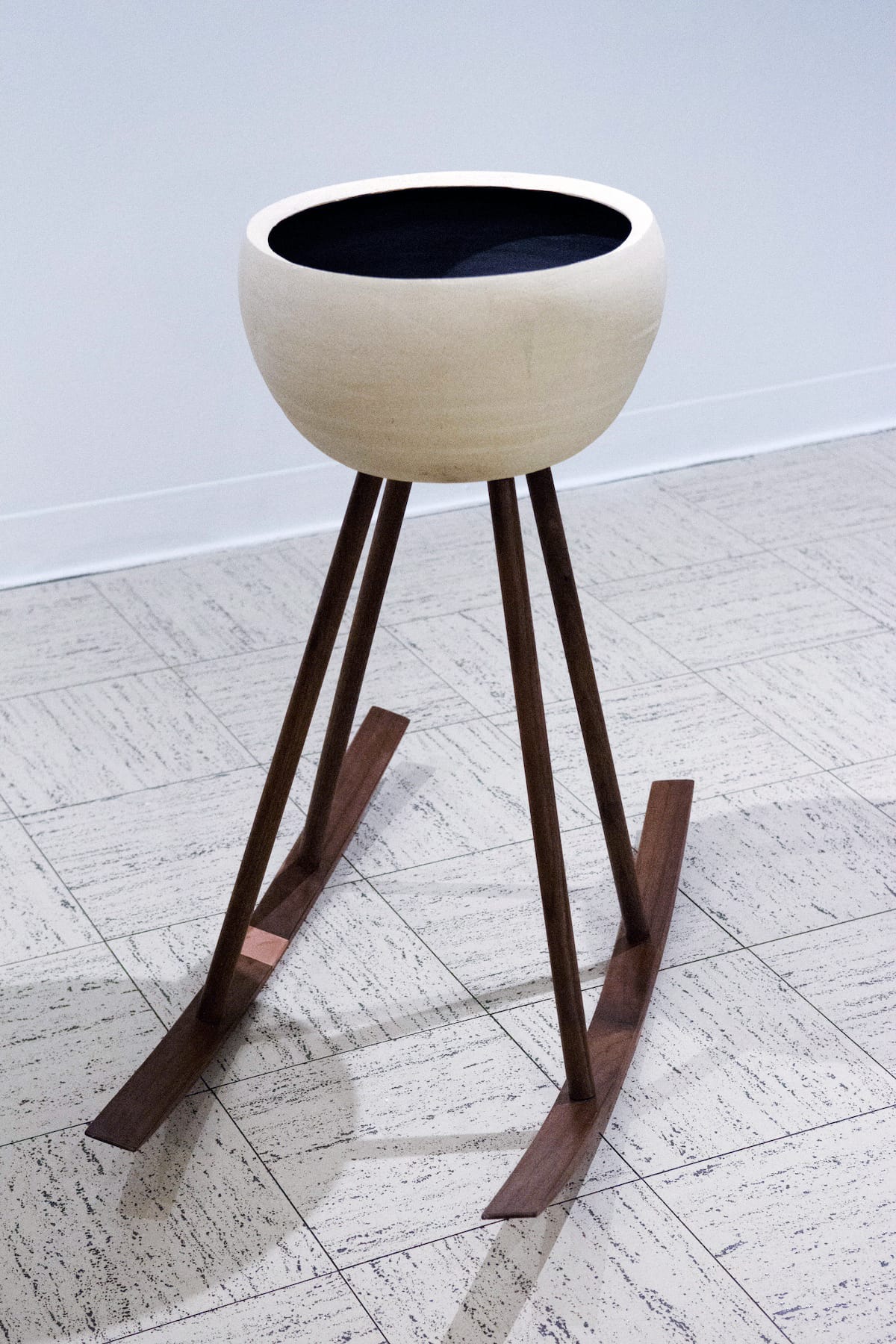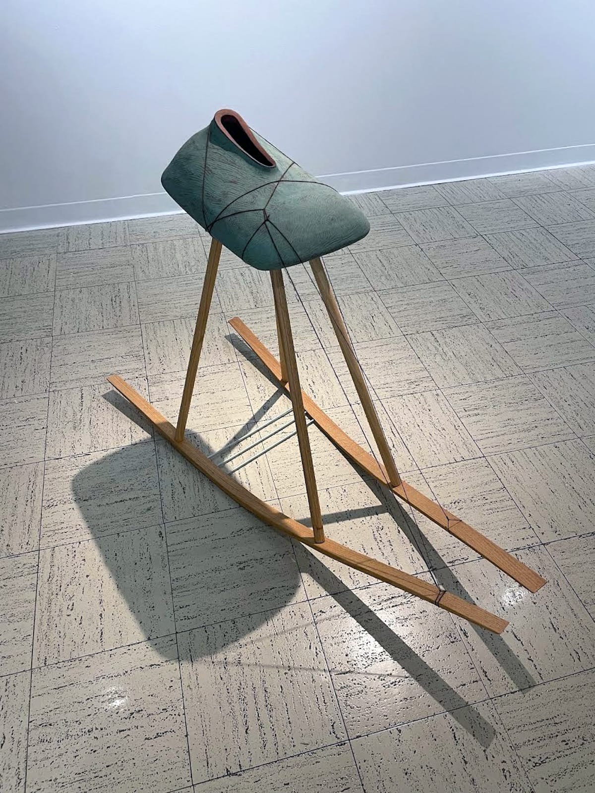 There are two pieces mounted on rockers that face each other from opposite ends of the exhibition. “Rocker 251 (Roland Too),” made of stoneware, graphite, wood, and copper, and “Rocker 242 (Freya)” made of ceramic, milk paint, wood, aluminum, and yarn. The body of both pieces is ceramic with four legs connecting the vessel body with bent wood rockers. Their proportions suggest rocking horses over furniture.