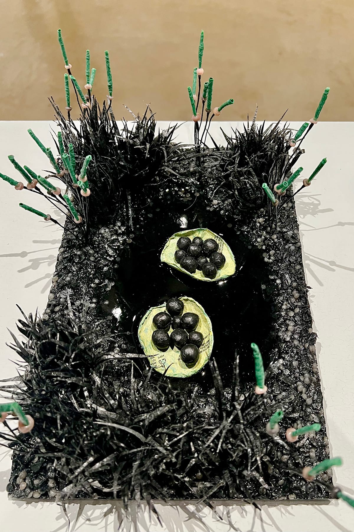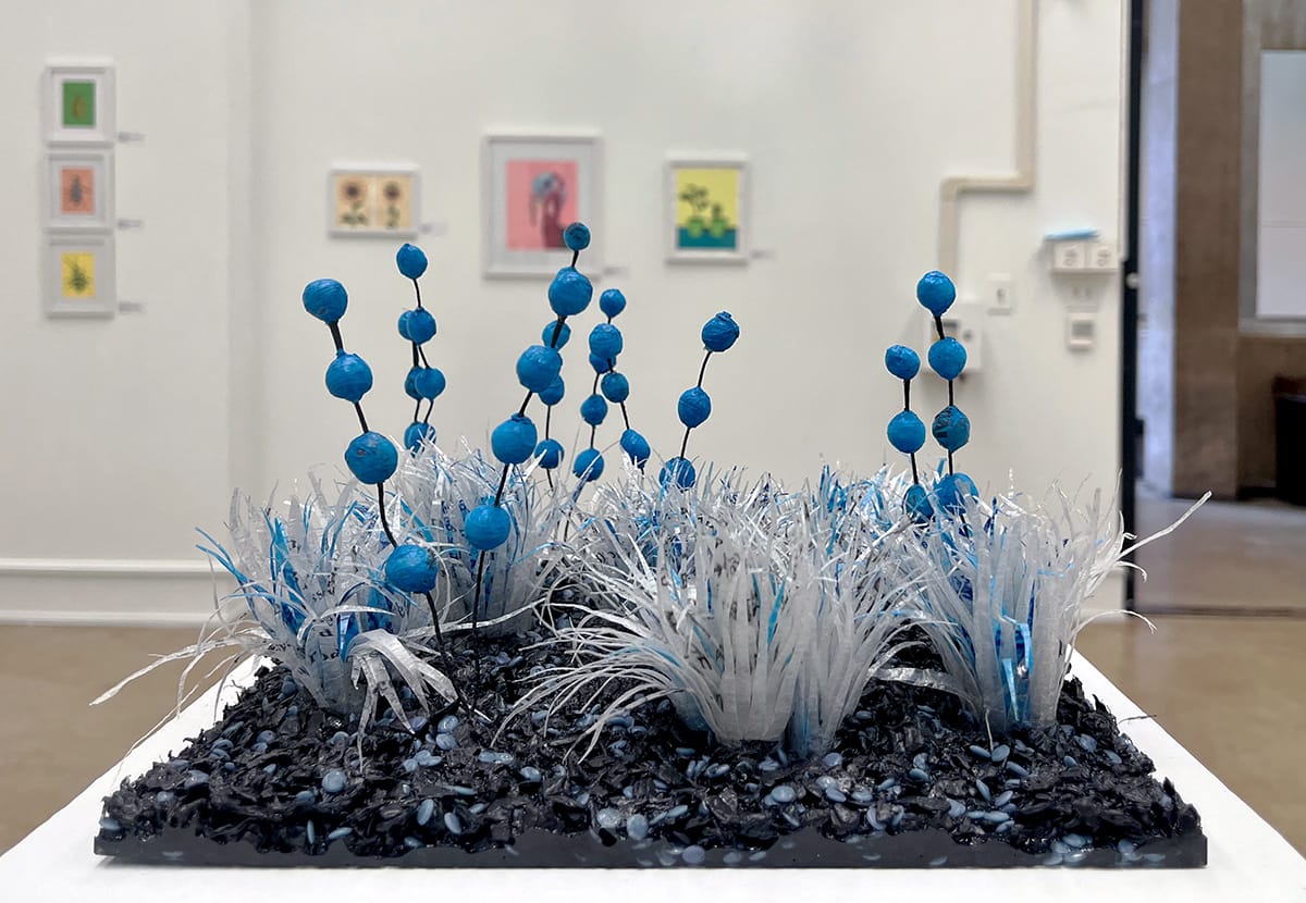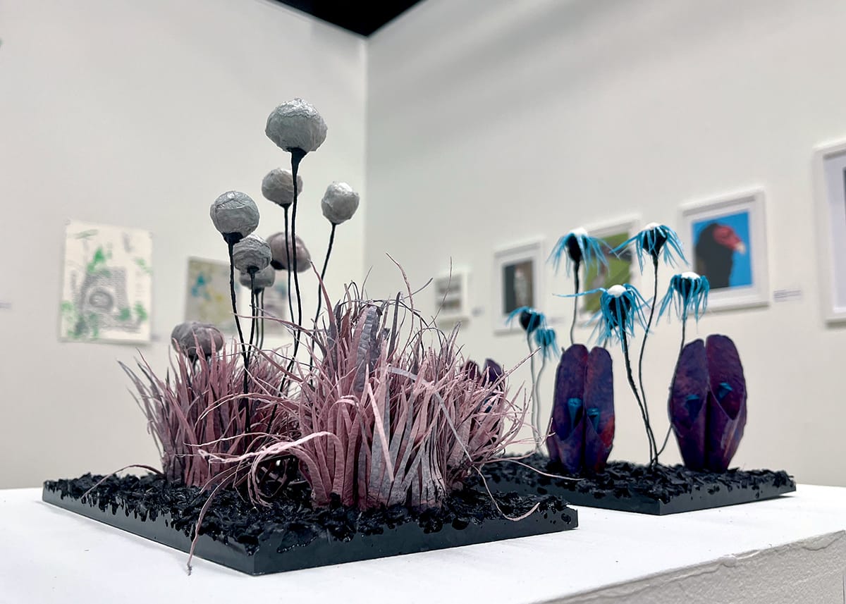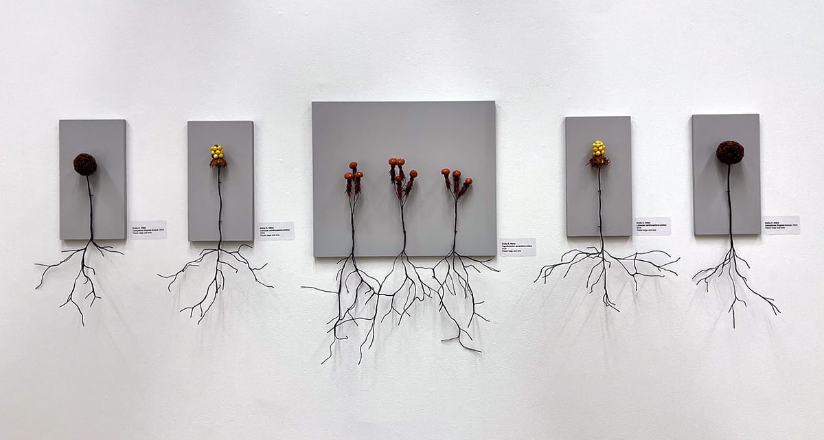 Works by Emily E. Ritter, from left: “Ecosystem #9,” 2018. This detailed sculpture uses unexpected materials — plastic bags, wire, HDPE regrind, and resin — to mimic an organic environment. “Ecosystem #14, 2018, plastic bags, wire, HDPE regrind, resin. Dark, grass-like textures cradle seed-like pods in this otherworldly environment. Photos by Skyler Lovelace for The SHOUT.