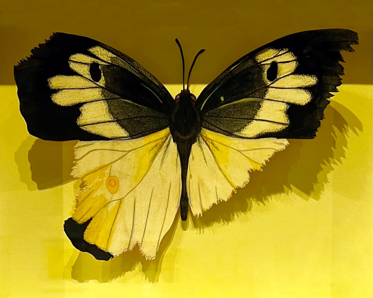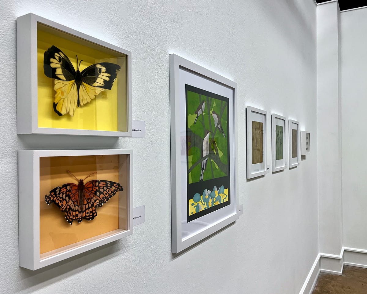 In the 2026 “Scars” series, Ritter explores how we carry our histories. For these works, Ritter returned to more traditional art materials — watercolor, colored pencil, and cut paper — to recreate vividly detailed butterflies native to Kansas. Pinned to colorful backgrounds and framed under glass, these creations look like biology-class specimens.