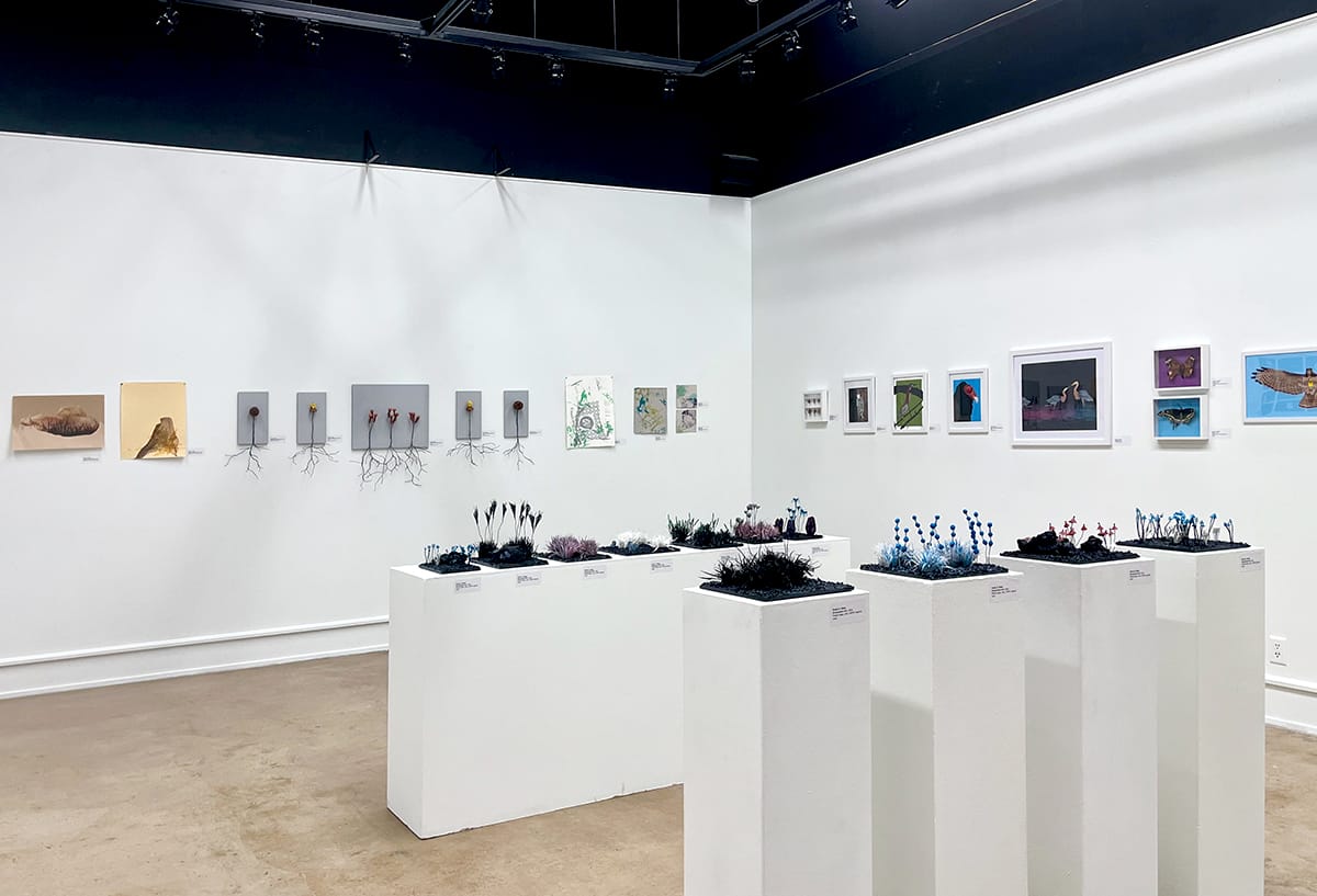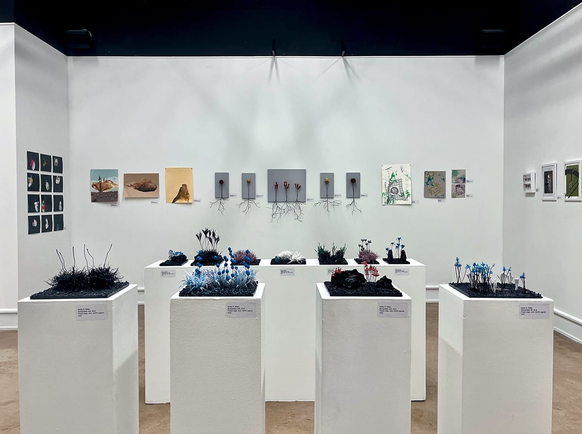 “Ecologies of the Self,” a solo exhibition by the interdisciplinary artist Emily E. Ritter, is currently on view in the Clayton Staples Gallery at Wichita State through May 15. Ritter is a WSU alum (Bachelor of Fine Arts 2012) and graduate of Arizona State’s Master of Fine Arts program in 2018. In this exhibition, she digs into “human irresponsibility and its consequences” while celebrating the evolution of ecological forms. 1