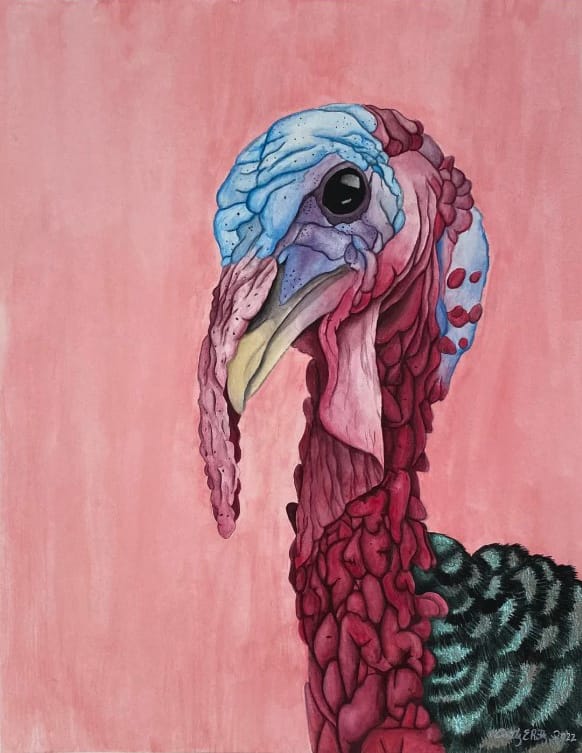 By 2022, Ritter had refined her work into detailed wildlife portraits. In the “Ecologies” exhibition, a gouache painting of the head and neck of a wild turkey, in shades of red, blue, and black on a pink background, underscores Ritter’s scientific precision and establishes a direct connection to native Kansas fauna.