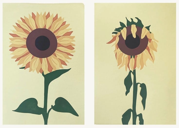 Moving into 2020, Ritter’s focus pivoted from physical sculpture to graphic observation. She also returned to her roots in traditional media and printmaking. This shift resulted in a series of regional flora and wildlife portraits. The screen print “Wilted” captures the life cycle of a sunflower, with an image of the flower in full bloom on the left and a depiction of the same flower with withered petals and leaves on the right. It reflects the artist’s interest in botanical decay and the passage of time.
