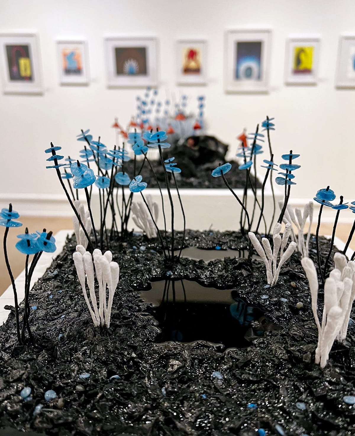 The "Ecosystem" series sits on pedestals like a row of industrial terrariums. Up close, the "soil" in these miniature landscapes is actually a dark, granulated plastic— black HDPE regrind. It’s a jarring realization to see the ghosts of old milk jugs and detergent bottles acting as the literal bedrock for Ritter’s flora. The flowers and blades of grass emerge from the black soil in unnatural colors and forms.