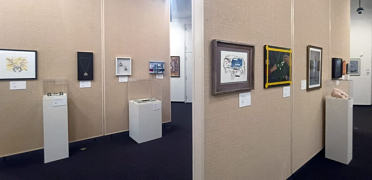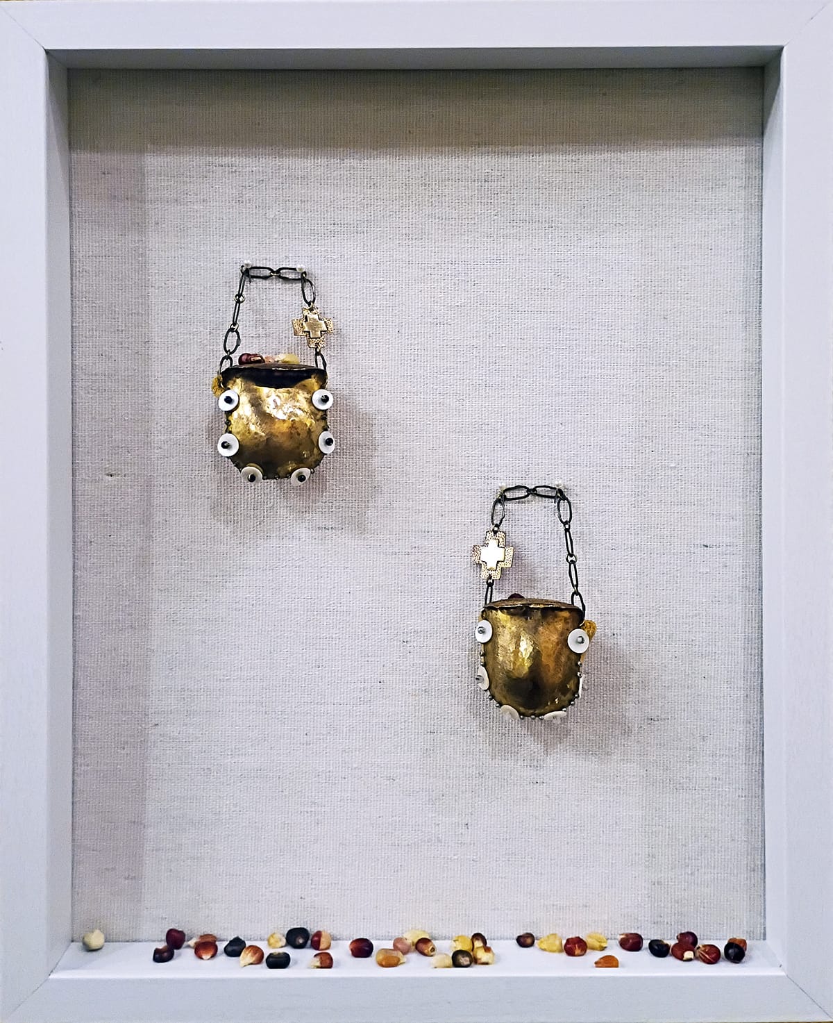 In “Seed Protectors: Stewards of the Future,” Rykelle Kemp invokes the handicraft and strength required to "protect that which nourishes our communities." Two brass pouches decorated with semiprecious stones hang from chains in a shadow box, with dried corn kernels of various colors scattered below them. Seed protectors were worn by indigenous women to hold the seeds their communities had long cultivated. When forbidden to wear external signs of their culture, the women sowed the seeds into the hems of their dresses.