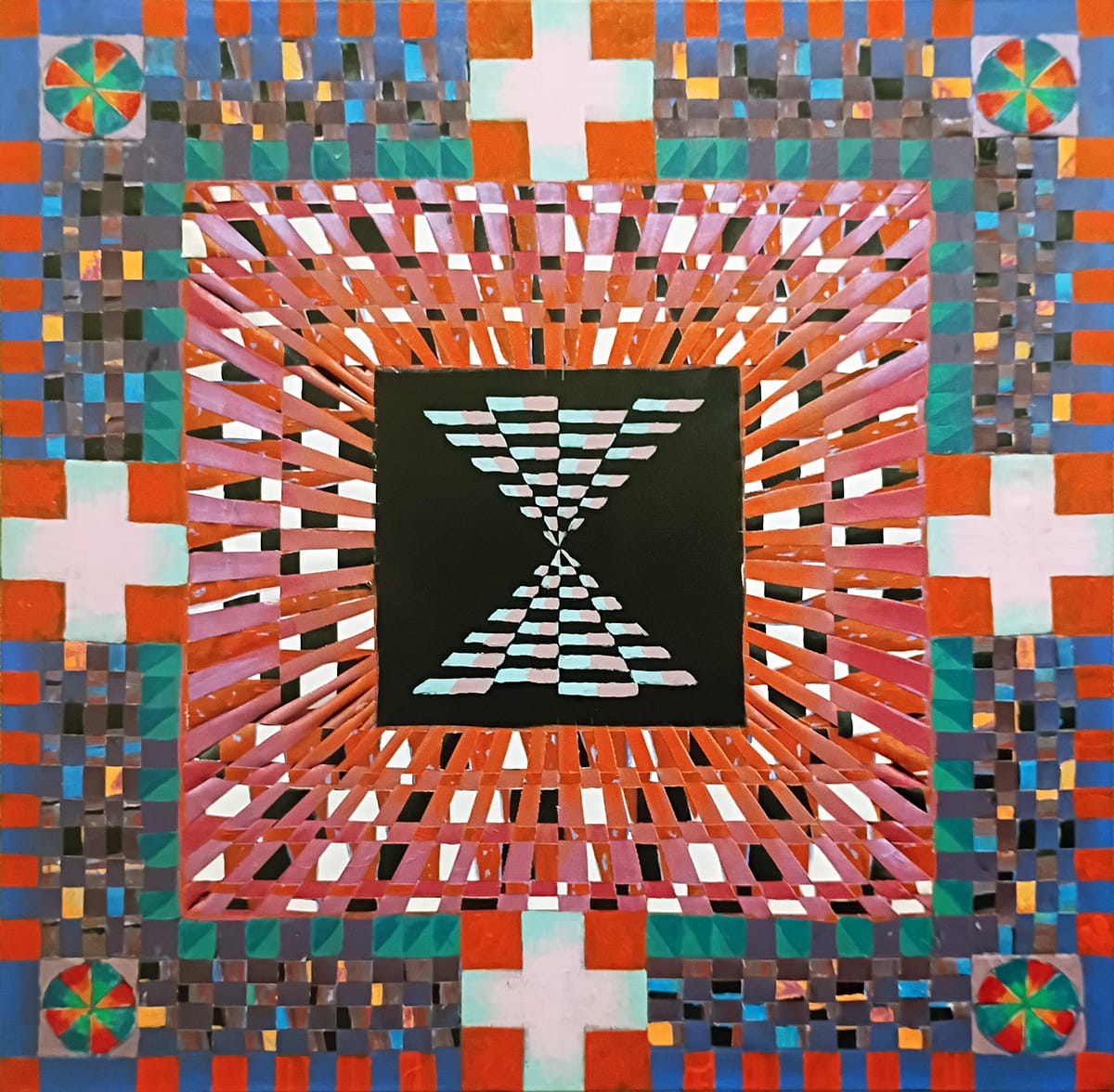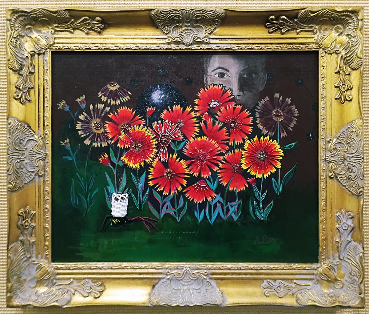 From top left: Bayley Ross, "Generational," graphite on paper; Jessi Sands, "Endless Warmth," wood-block print on paper; Kalyn Fay Barnoski, "ᎢᏳᏊᏂᎦᎵᏍᏗ / ᎾᎿᎯᎸᏢ (sometime / somewhere)," acrylic and spray paint on stretched canvas, woven; Raychelle Shabi, "The Alchemist," acrylic and beadwork on canvas; Carmen Wiley, "Wired Shut," contemporary poetry textile; Jaime Misenheimer, "Nashoba (Wolf)," oil in linen. Photos by Jeromiah Taylor for The SHOUT.
