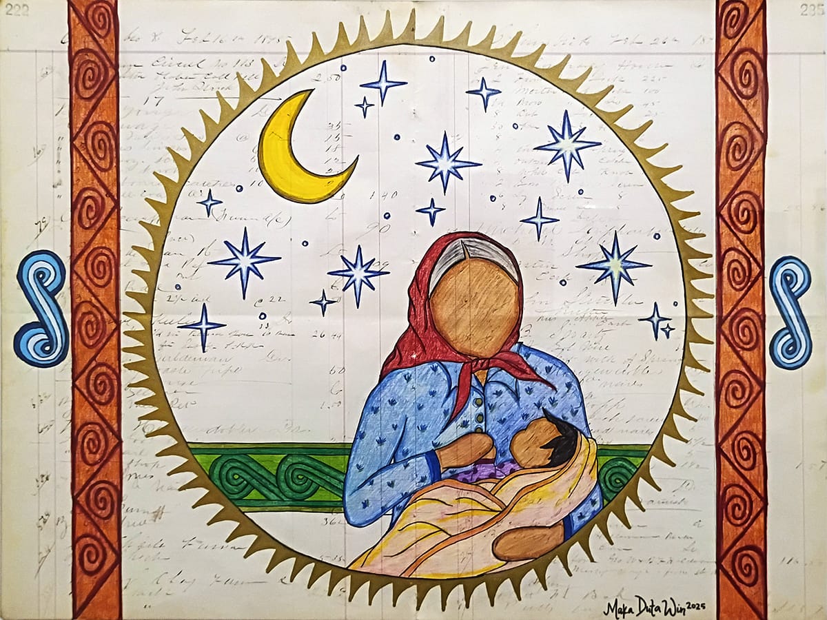 The facelessness was the first thing I noticed: initially, in a quite literal way, in the two-dimensional works, then in the form of two mannequins, and finally in the ubiquity of totems. A poignant instance of figural facelessness appears at the front of the exhibition in "Our Grandmothers Knew the Stars" by Brittany Hill. A drawing on ledger paper, the work portrays a faceless grandmother cradling a faceless baby.