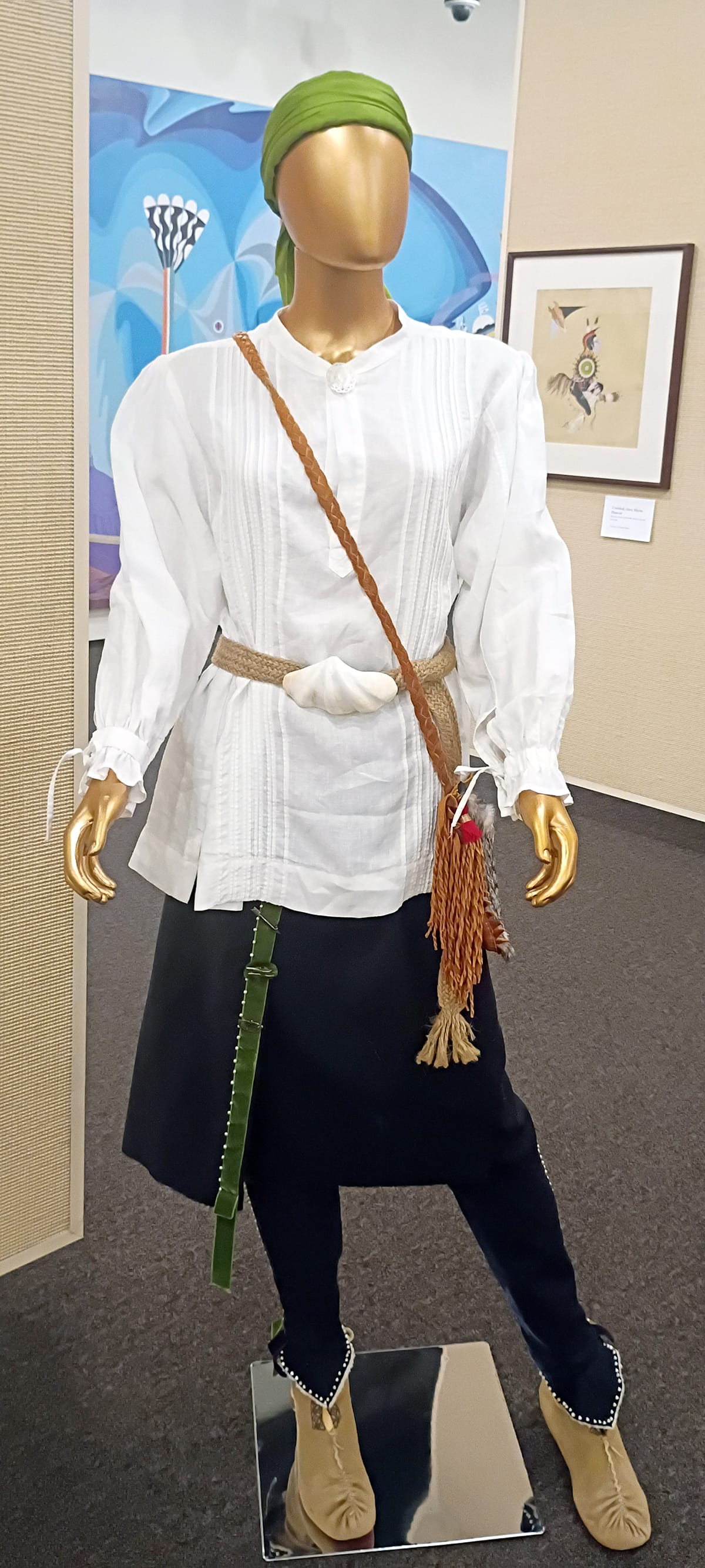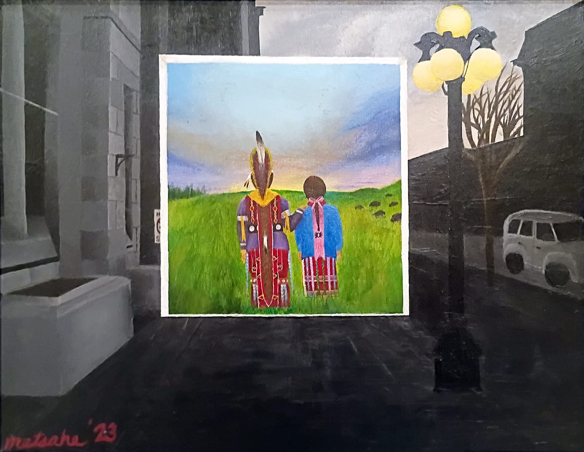 In the painting "A Step Between Two Worlds" by Little Star Gallegos, two figures in regalia, their backs turned to the viewer, consider the open plains in full color, and yet they are framed by the background of a black-and-white urban scene. The contrast is telling. And Irene Creek's glass and shell necklace titled "Where the River Flows" is described on the title card simply as a "contemporary spin on a traditional southeastern beaded collar."