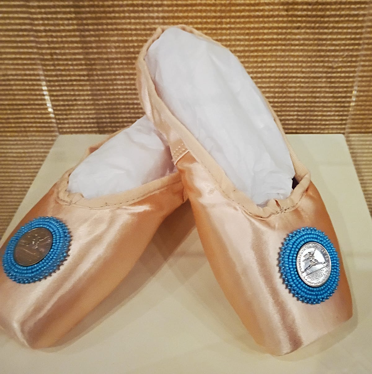 For instance, Dana Bear adapts Osage moccasins to the exigencies of ballet. Bear's "For Those Who Cannot Dance" features a pair of pointe shoes embellished with Osage beadwork and a coin on the toes. The shoes were made in honor of Bear's great-aunt Maria Tallchief, the first Native American prima ballerina (whose likeness and name are commemorated on the coins). They were presented to the contemporary ballerina Misty Copeland in 2023.