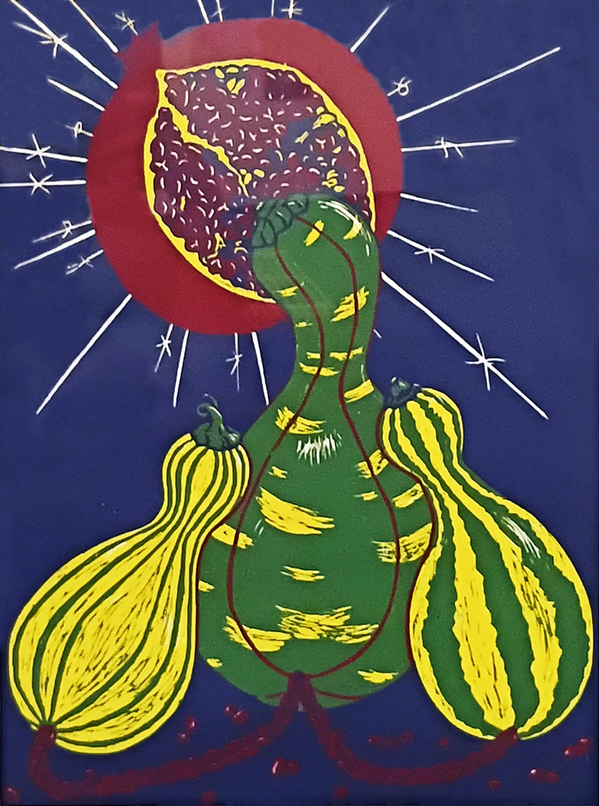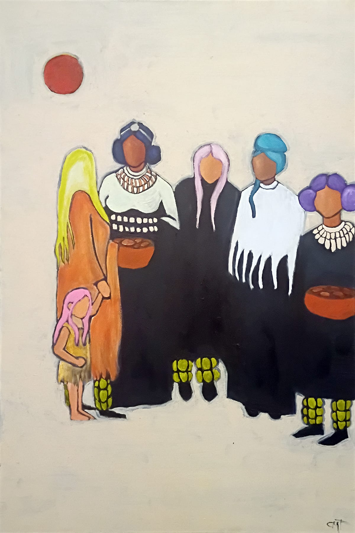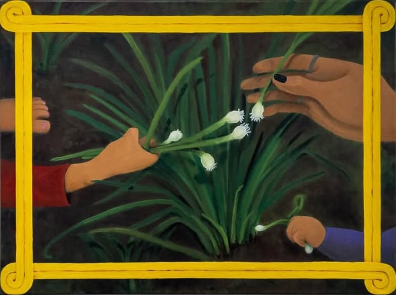 Totems are their own form of facelessness, whereby the personal is rendered iconic. “I” disappear into a “we” symbolized by an “it”: corn, wild green onions, a shell filled with seeds. The “it” reminds me who I am: one of us. A member of a body of women who marked time by the color of plants, who carried seeds close to their chests as they were violently ripped from their homes. Jessi Sands' oil painting “Lanē” depicts the hands of children and an adult foraging for wild onion, tafvmpuce, sacred to the Mvskoke people. "Lanē" means "growing season" — the onion's life cycle from green to yellow to brown represents "Mvskoke cosmology and our connection with the land," according to the exhibition text.