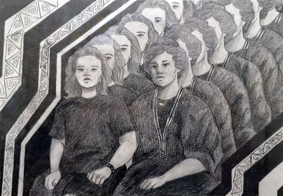 In Carly Treece's oil painting "Generational Voices," the gathered women dressed mostly in black and lined up together as if for a photograph are also faceless. And in the graphite drawing "Generational" by Bayley Ross, the faces of a young woman and an older one are repeated and blurred by tessellation — stretching into the anonymous past.