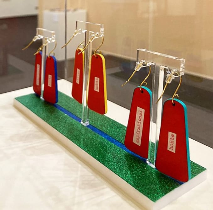This is an emblematic detail that is invoked in the title of Okcate Evita Smith McCommas' “Sew the Seeds: Three Generations,” a set of three pairs of red painted wood earrings with the words “imaginative,” “clever,” “inspirational,” and “hokta” emblazoned on them in red text on white fields. The two titles of Kemp and Smith McCommas’ works, “Stewards of the Future” and “Sew the Seeds,” encapsulate the dynamic of tradition. "Stewardship" sounds like a stuffy word, despicably preservationist. But Kemp understands that a steward’s obligation is not to the past but to the future. When the seed protectors are lost, you sew the seeds so that you may sow them once again.