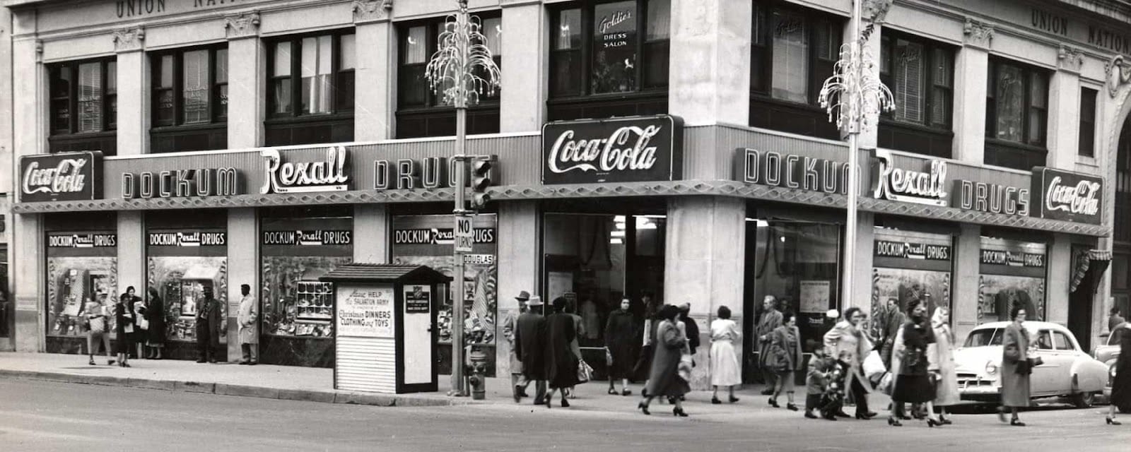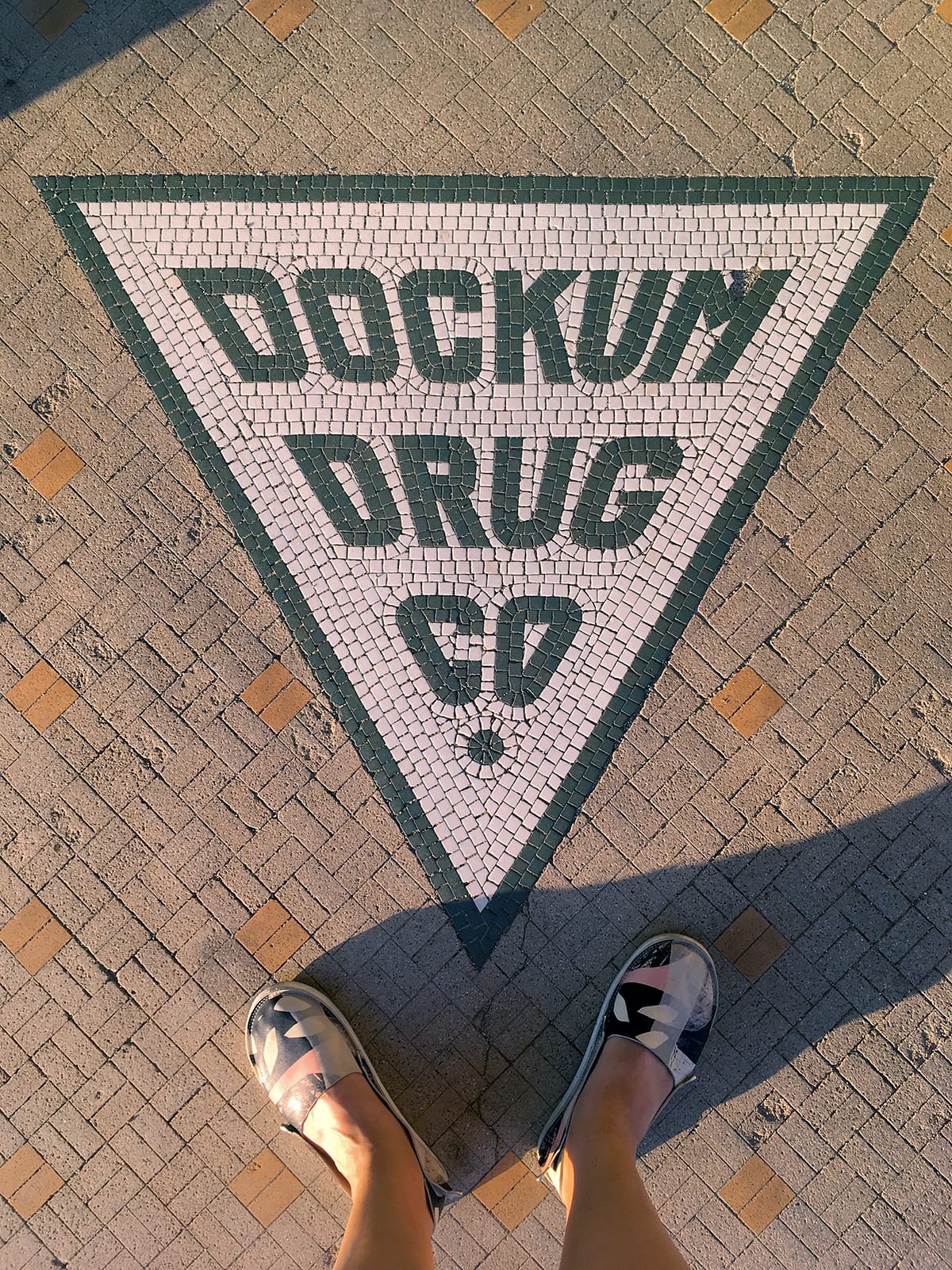 Over the years, I have collected photographs of letterforms across urban landscapes on my travels and in the places I’ve lived. One of the first pieces I photographed after arriving in Wichita was the tile lettering of Dockum Drug Co. It was late in the summer, the sun already low and spotlighting the floor signage, giving it a warm light overcoating. The suggestive, reversed triangle seemed to nudge me: take my photo. I later shared the image with a colleague and learned that Dockum Drug Store. was an important historic site in the U.S. Civil Rights Movement.