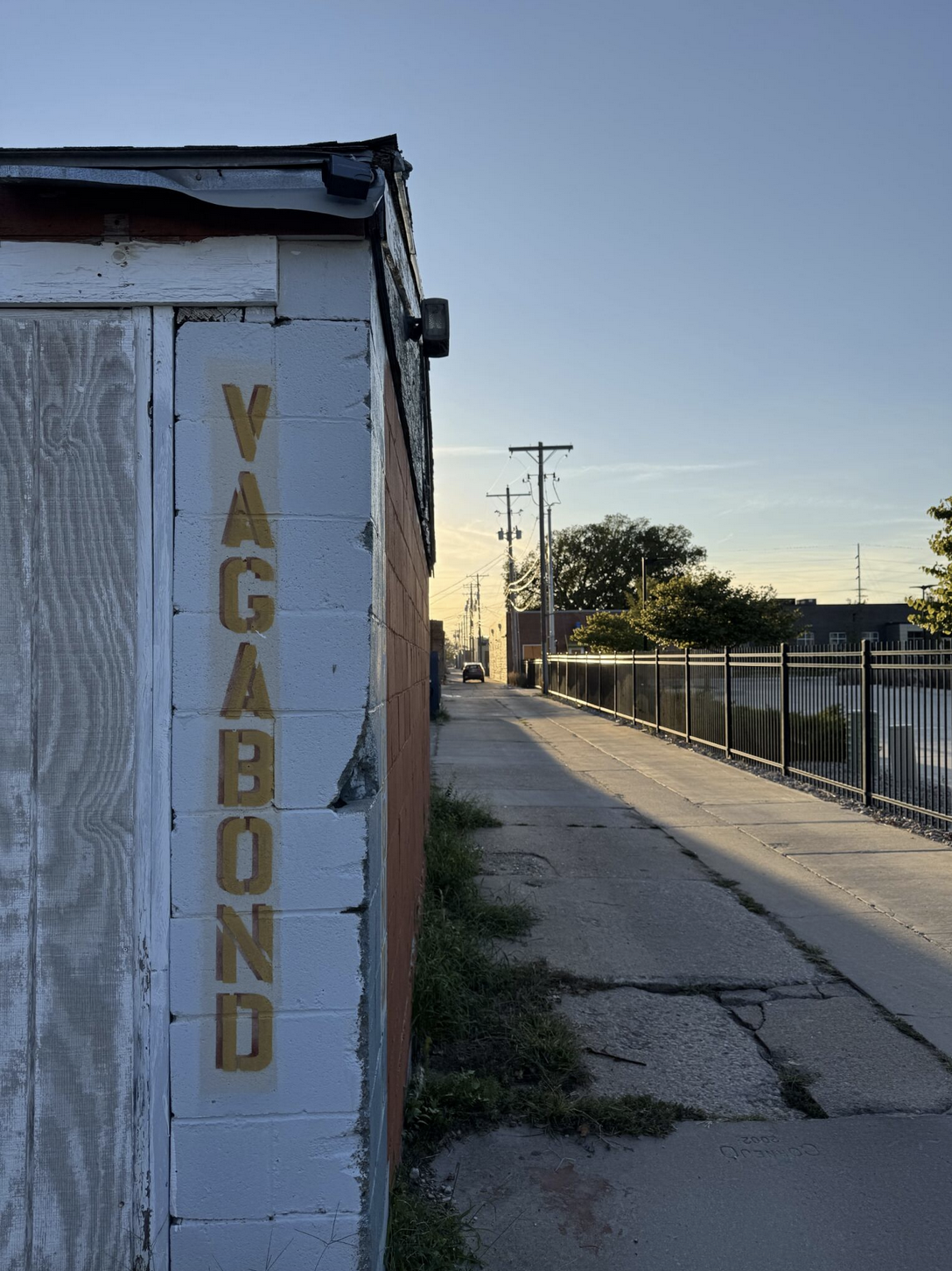 Out back, a bold vertical stencil version of “Vagabond” appears, echoing the kinds of utilitarian building signage painters once made.