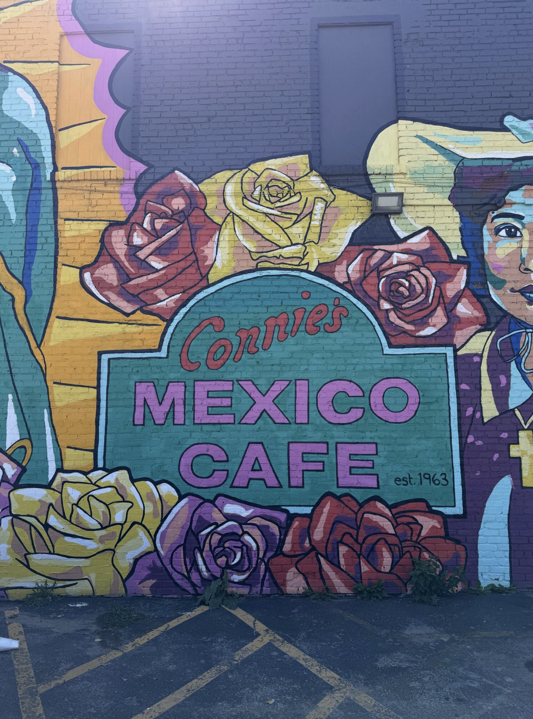 At first, the designer in me noticed its minimal, Euro-centric, sans-serif style. It didn’t carry the same cultural references as the mural’s illustrations and I wondered why. But then I began to see the contrast differently. Perhaps the plainness of the type offers space for projection. The mural sets the stage, and the lettering becomes a kind of wireframe — an open container for the viewer’s own associations. Or perhaps it stands as a bridge between two cultures: Connie’s heritage and the local, commerce-driven signage. In any case, it seems like the mural’s lettering is less about representing Mexico and more about holding a space where community identity can be filled in by each viewer.