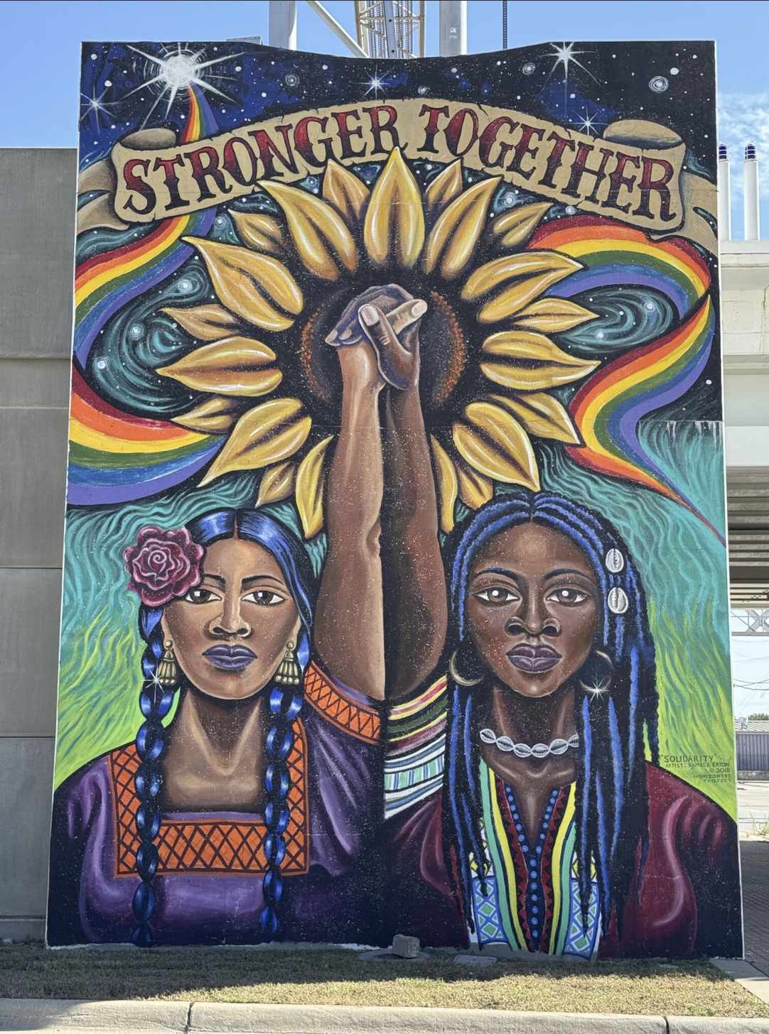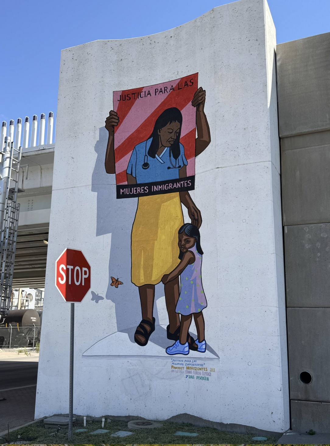 On display next to "Stronger Together" is another bold mural by artists Connie Fiorella Fitzpatrick and Dave Loewenstein titled "Justicia para las mujeres immigrantes (Justice for Immigrant Women)." When I photographed this site, a stop sign stood at the edge of the frame. Sunlight caught only the first letter S, leaving the rest of the letters in shadow. This accidental highlight was not designed or planned by the muralists, but it became part of the composition at that moment.
