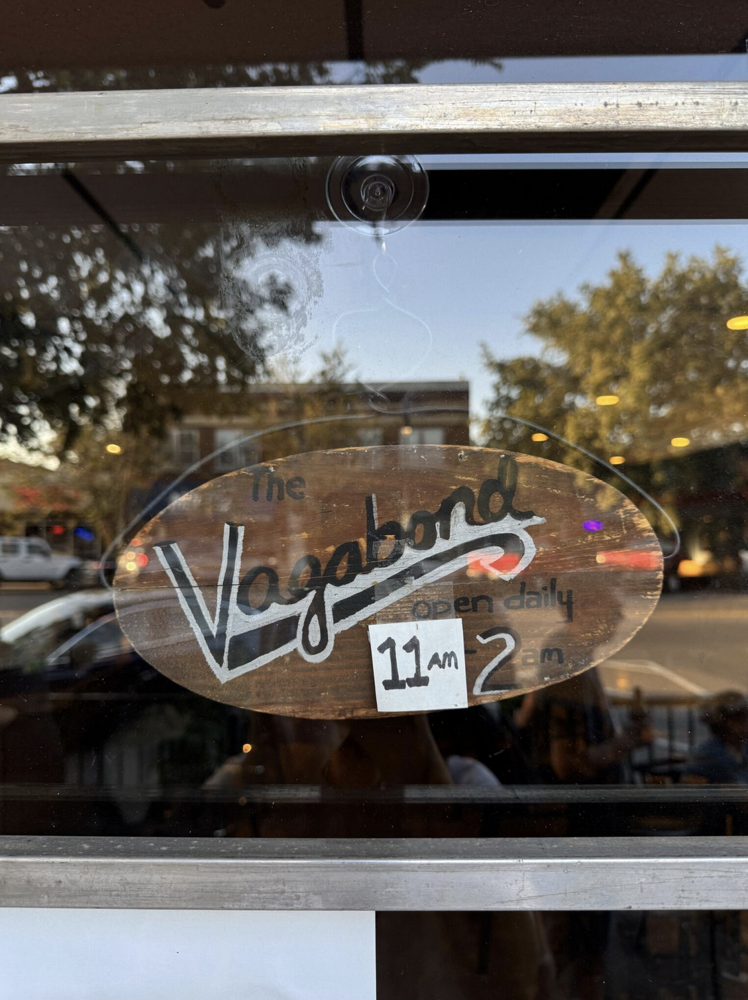 Its front window features an eclectic collection of signage, including the wording “The Vagabond” in a sans-serif style with an outline. On the front door, the name is written with a brush, imitating the old-fashioned style of outdoor advertising or early print ads. Over time, the opening hours changed, and, instead of remaking the sign, the owners simply taped a sheet of paper over it and wrote the new time in marker.
