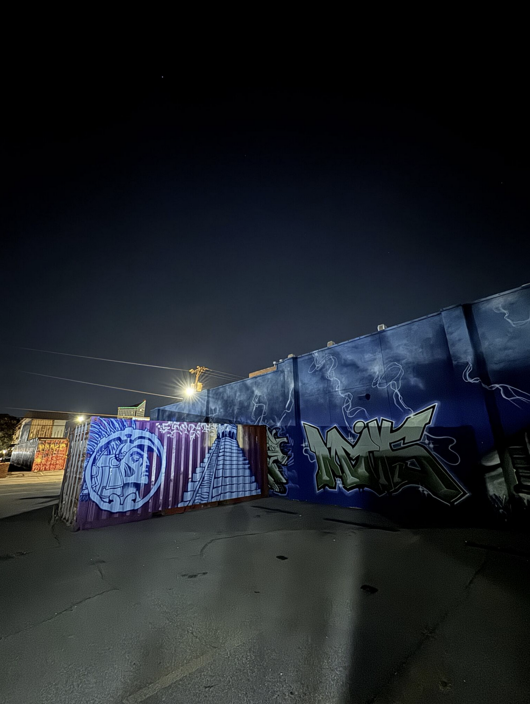 I often walk home after First Fridays — at least when Kansas weather behaves. Strolling one Friday night, I decided to take a detour to see the graffiti on the nearby shipping containers (part of the visual identity of Somewhere Fest), as I usually pass by them during the daytime.