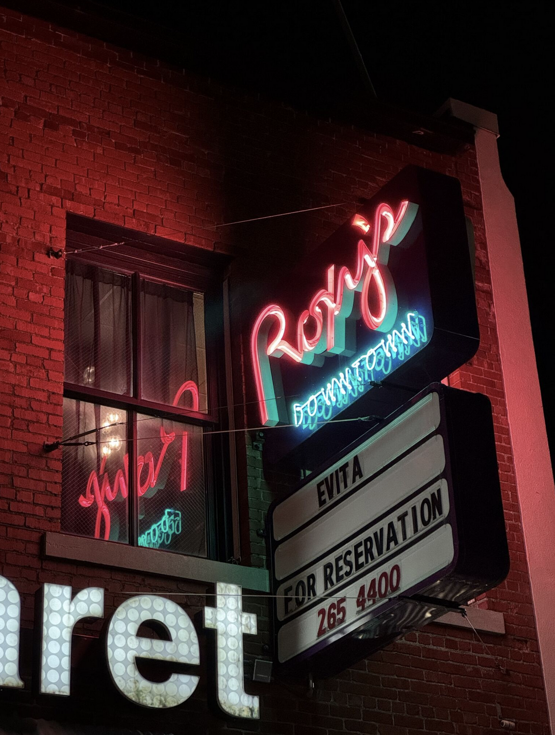 Nighttime letterforms … now those are a treat. When I first photographed the Roxy’s Downtown sign, I was drawn to the way it flickered at night, with its neon red and green reflecting and doubling the words across the window. It felt alive and performative, as if the sign itself were on stage.