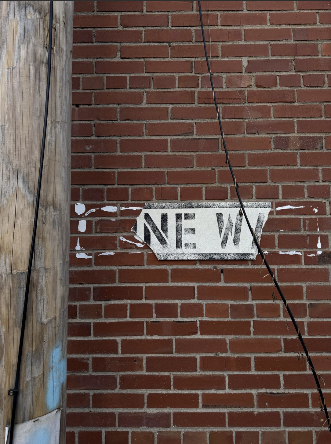 On one city block, I found two small signs that have unintentionally transformed over time. The first is a fragment of a larger sign. The left side had broken away, leaving only the tail of one word “NE,” which happened to line up with the start of another word beginning with “W.” What was once two words had collapsed into one: NEW. The accident created a new meaning. It was as if the city had curated a fresh piece for its gallery wall.