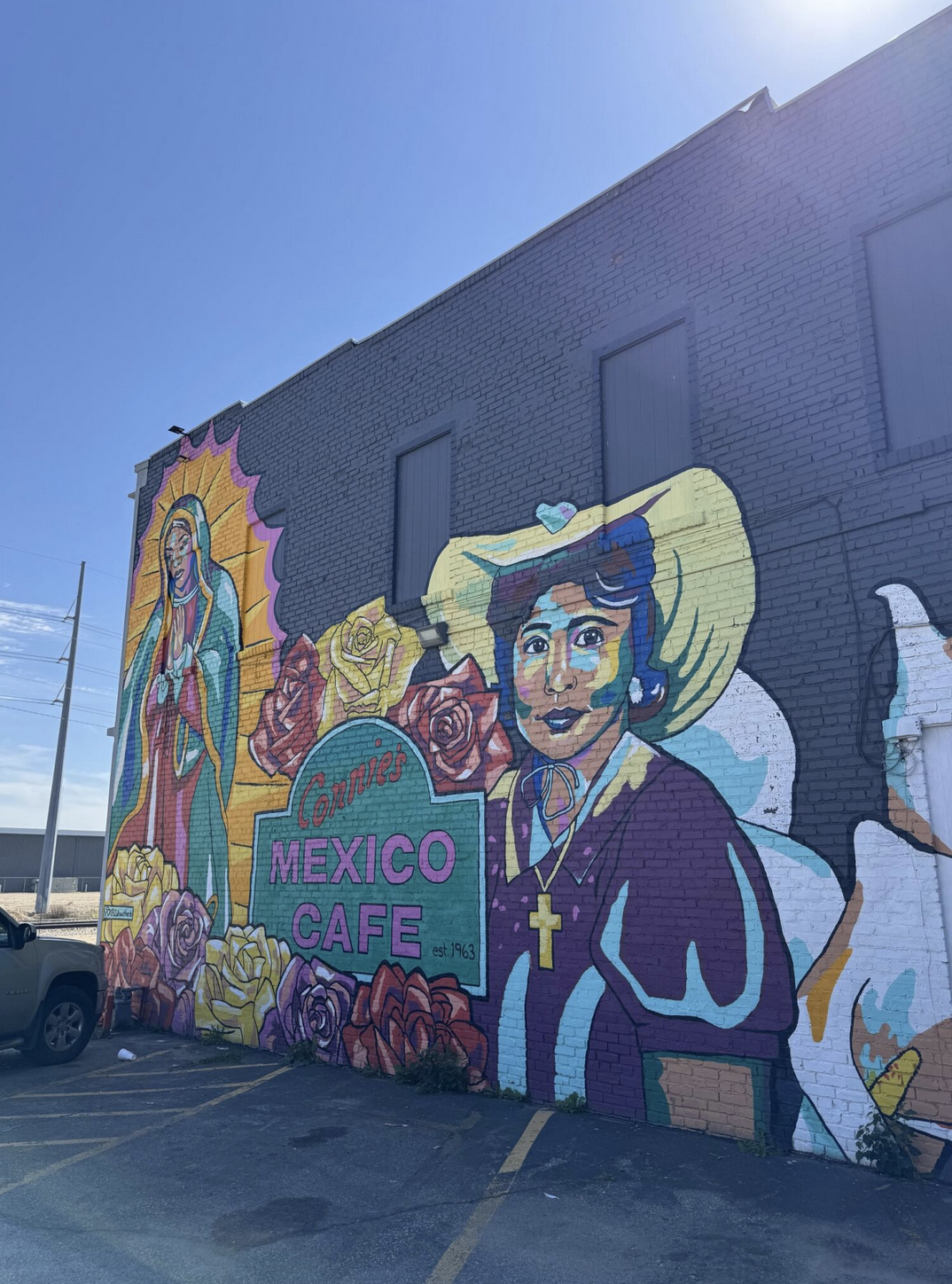 Sometimes I intentionally look for lettering examples that I can show to my students. When I learned that a muralist had painted the building housing Wichita’s long-standing restaurant Connie’s Mexico Café, I biked to the north side of the city to capture it. What struck me was the way the imagery greets the viewer with joy and vibrant energy — echoing Mexican culture through color, illustration, and a depiction of the Virgin Mary — while the lettering felt somewhat static in comparison.
