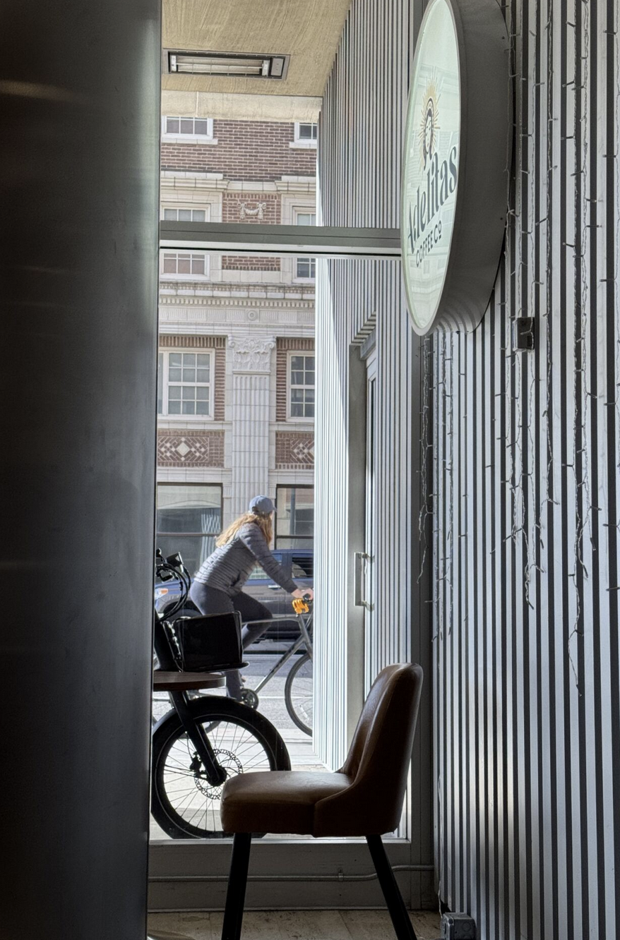 On Saturdays, I often find myself at Adelitas, a local coffee shop I go to for a date with a book. One morning, I took a snapshot from my table — not of the coffee in front of me, but of the view across from me surrounding and through the window. In the frame were layers: the Adelitas logo on the plastic sign board, the glass pane reflecting and refracting the street, the building across the street signaling downtown, and, at just the right moment, a cyclist passing by.