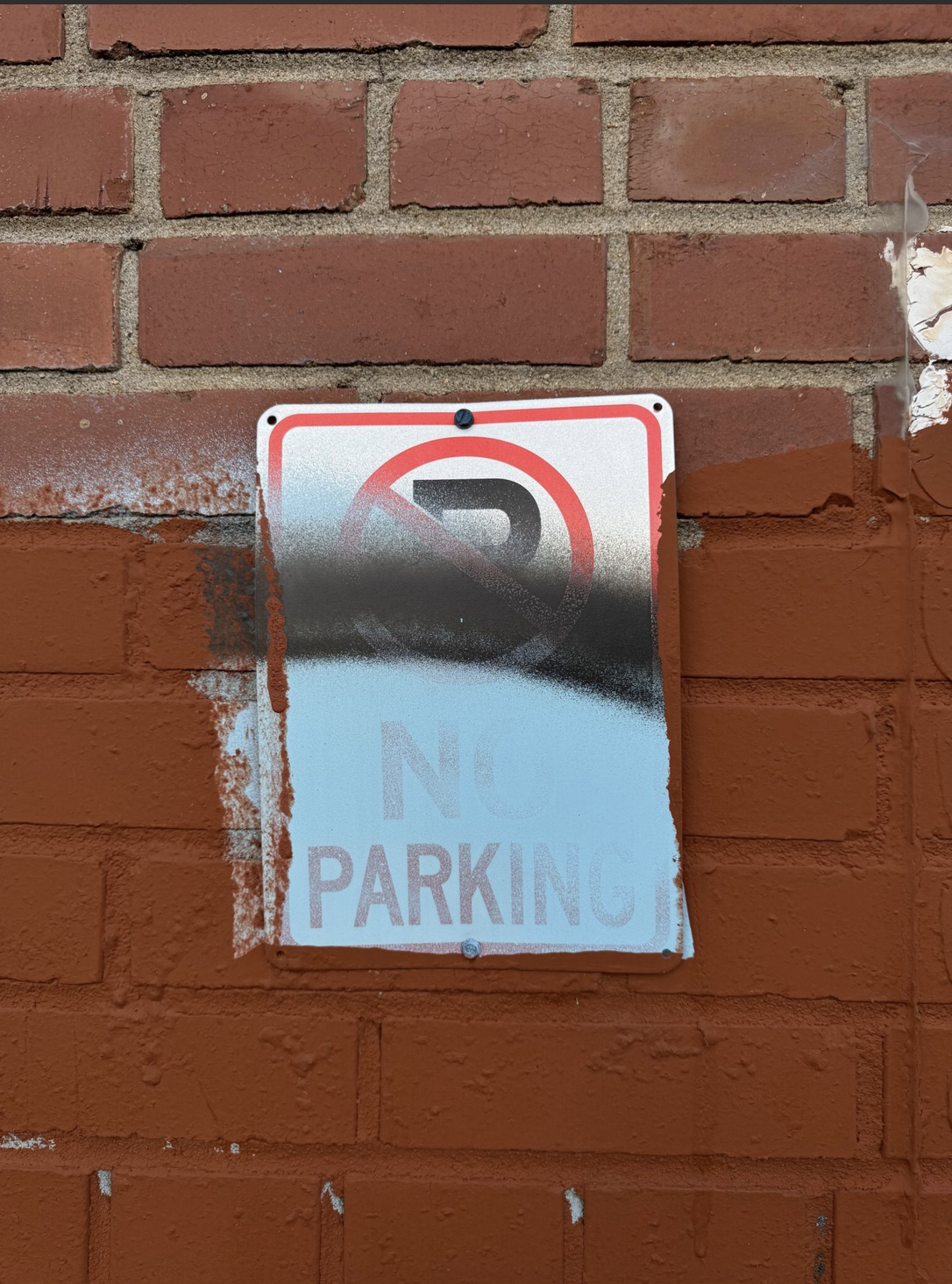 Next to it was a small No Parking plate thickly spray painted to the point where only “PARK” remained most visible. What had once been prohibition now read as permission.