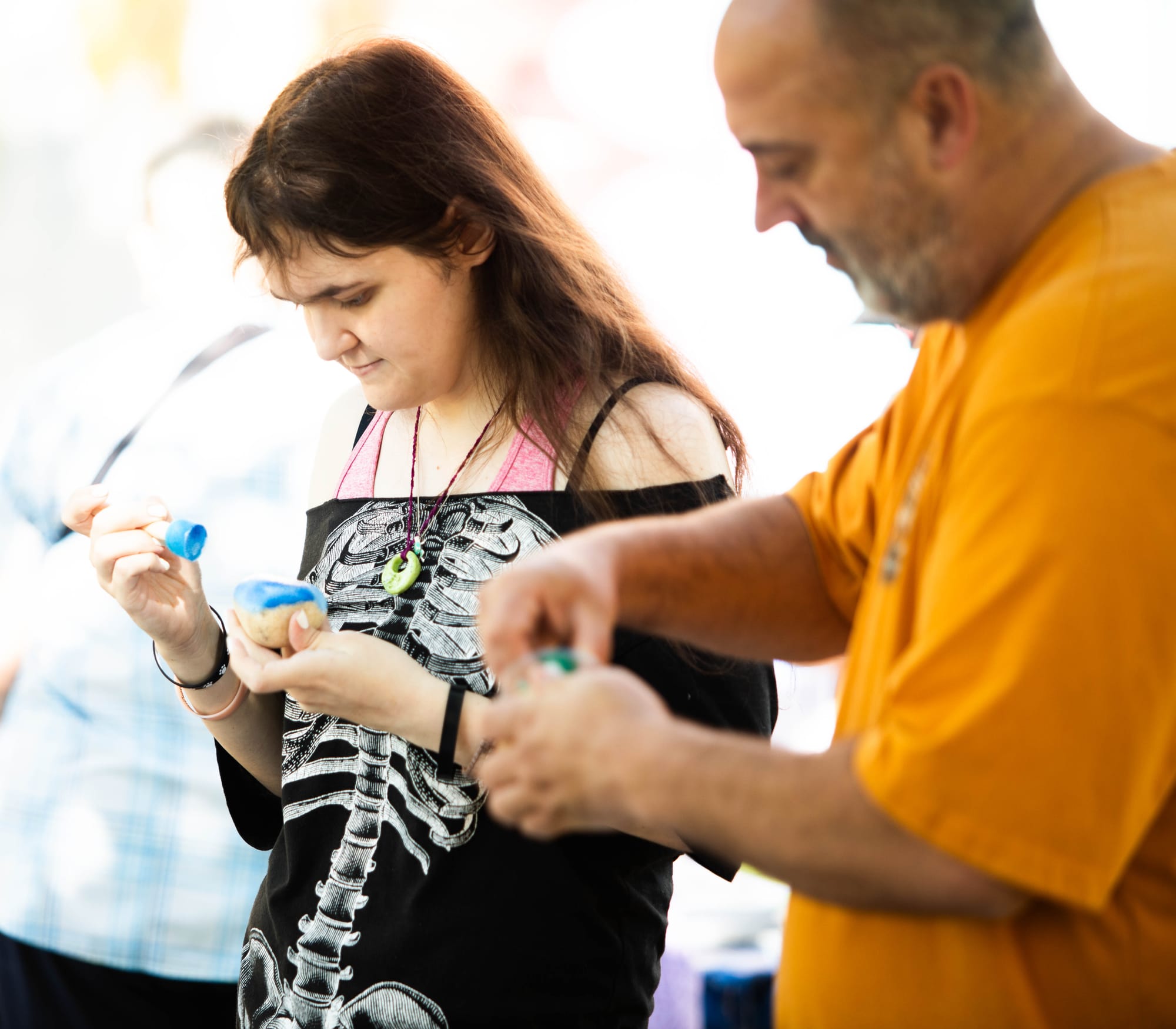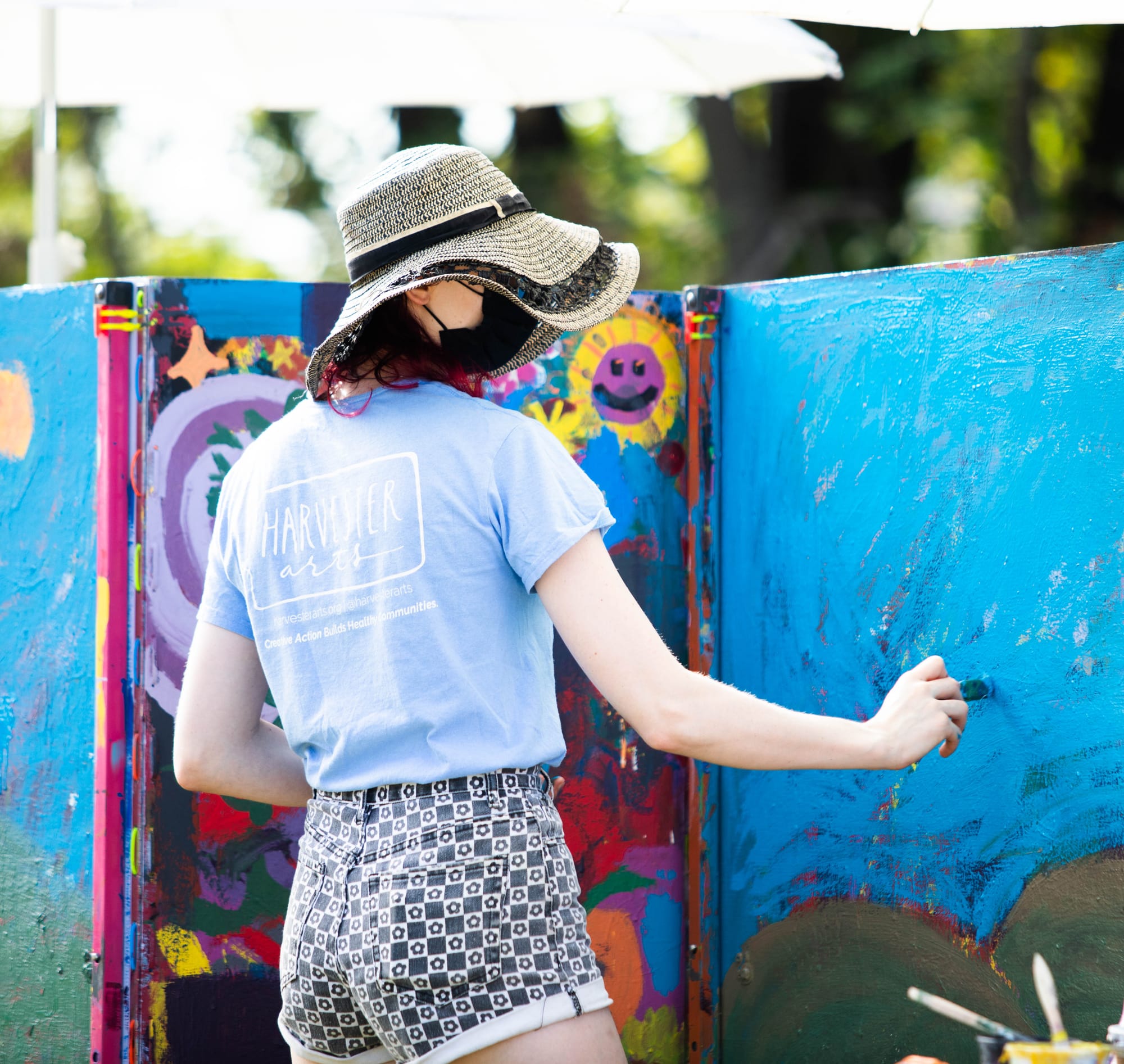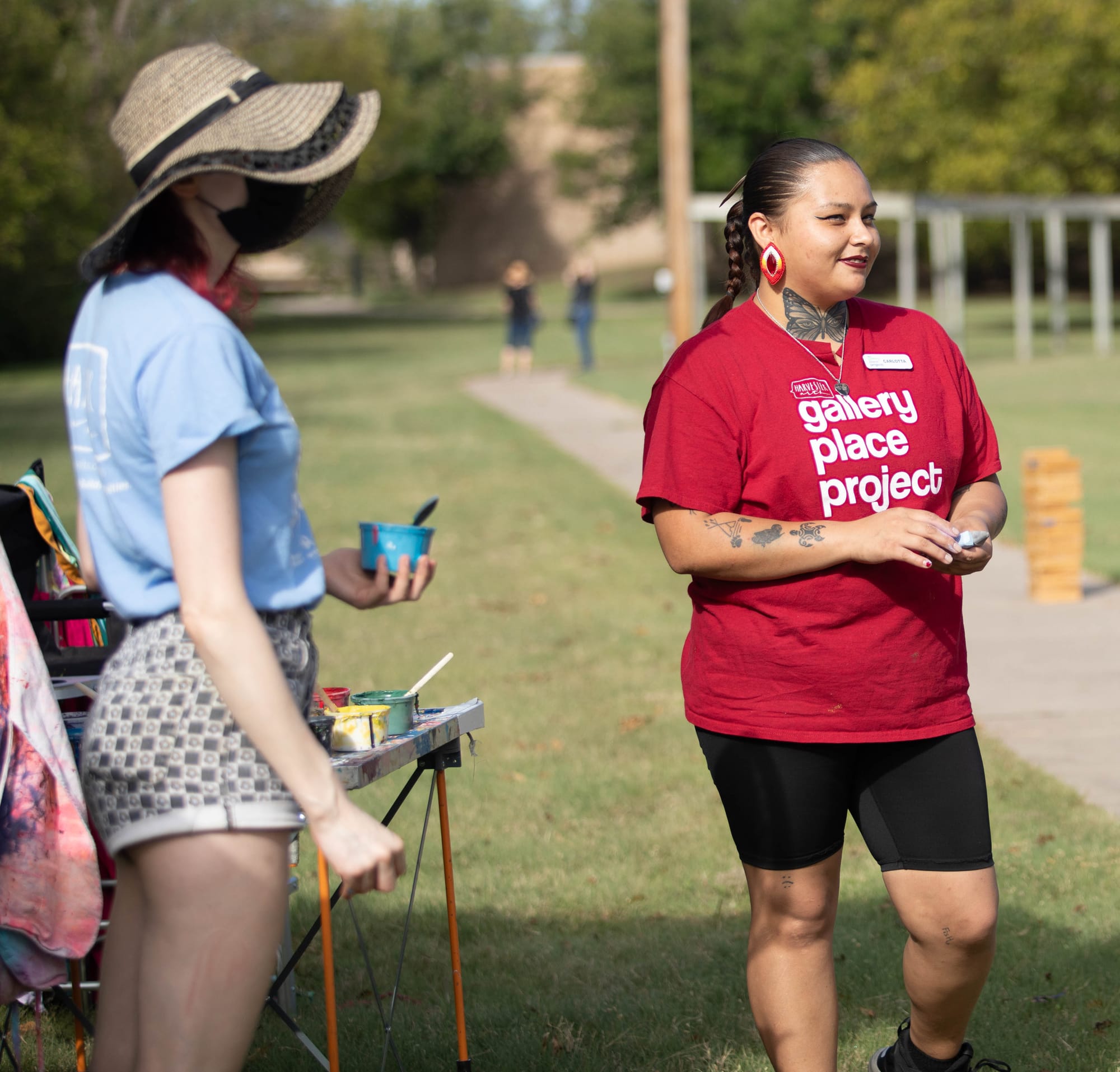 Janine Shin (left) and Carlotta Evans, artists who work for Harvester Arts, welcome visitors to ICT Bee Fest at the Mid-America All-Indian Center. At right, Shin demonstrates how to paint the Mobile Mural Wall. Photos by Julian Kincaid for The SHOUT.