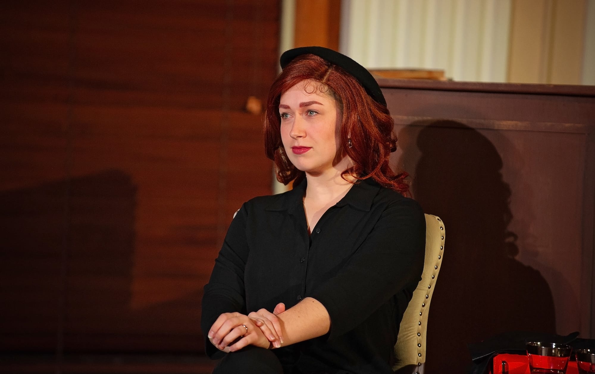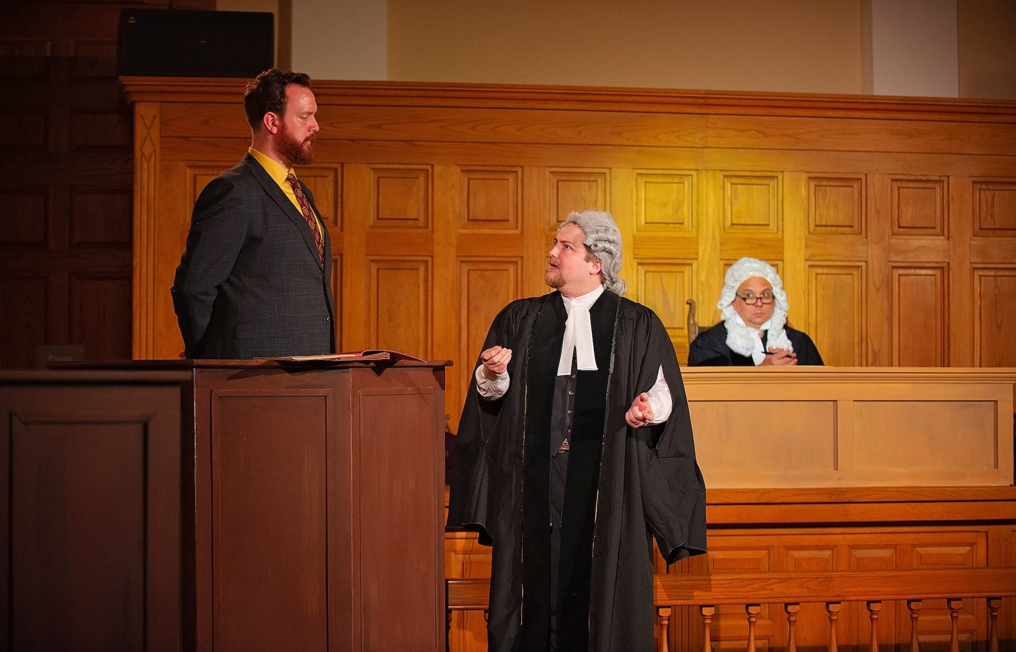 The courtroom staging distracts in a couple of ways. It makes some moments difficult to hear: John Mayhew, played by Eddie Spurlock, is responsible for important exposition that does not all come out clearly. Similarly, when Sheldon Loucks tries for quiet intensity, sometimes all the audience gets is quiet. This means some of the character’s best lines (“Men, I often think, are very stupid”) get lost. Another challenge of the space is that actors who are showing natural reactions can pull focus from the main action simply because they are physically distant from it. This happens, for example, when Gwinner is reading a juicy newspaper article and when Simmons is in court.