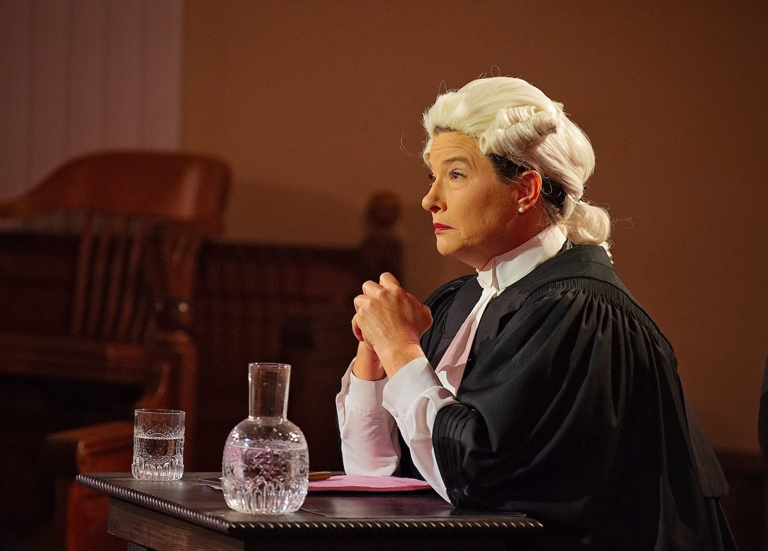 All we know about Myers, the prosecutor, is that defense barrister Robarts dislikes her mannerisms and courtroom technique and therefore especially enjoys besting her. Casting Janssens in the role, originally written for a man, adds a hint of gender dynamics. Janssens leans into the competition, reacting to Gwinner with a wrinkled nose and slow blinks while dominating the courtroom with a piercing, precise voice. Robarts, by contrast, believes himself to be a purist (“I only want the truth”) but seems to care most about winning.