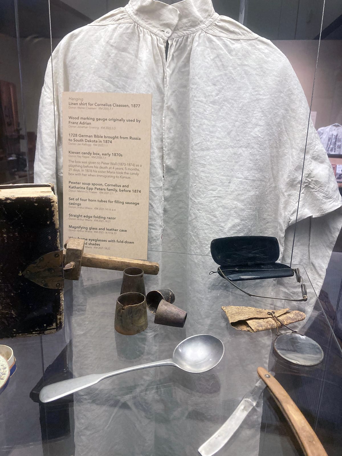 The museum’s exhibit puts a spotlight on five families — all Mennonites — who migrated through Canada and into Kansas, Indiana, Illinois, and Nebraska: the Jansens, the Krehbiels, the Funks, the Warkentins, and the Rempels. Each of the men in these families were leaders in the Mennonite communities that later grew out of the settlements they joined. Their artifacts indicate what more affluent Mennonites were able to bring with them. Less well-to-do community members are not as well represented in this exhibition.