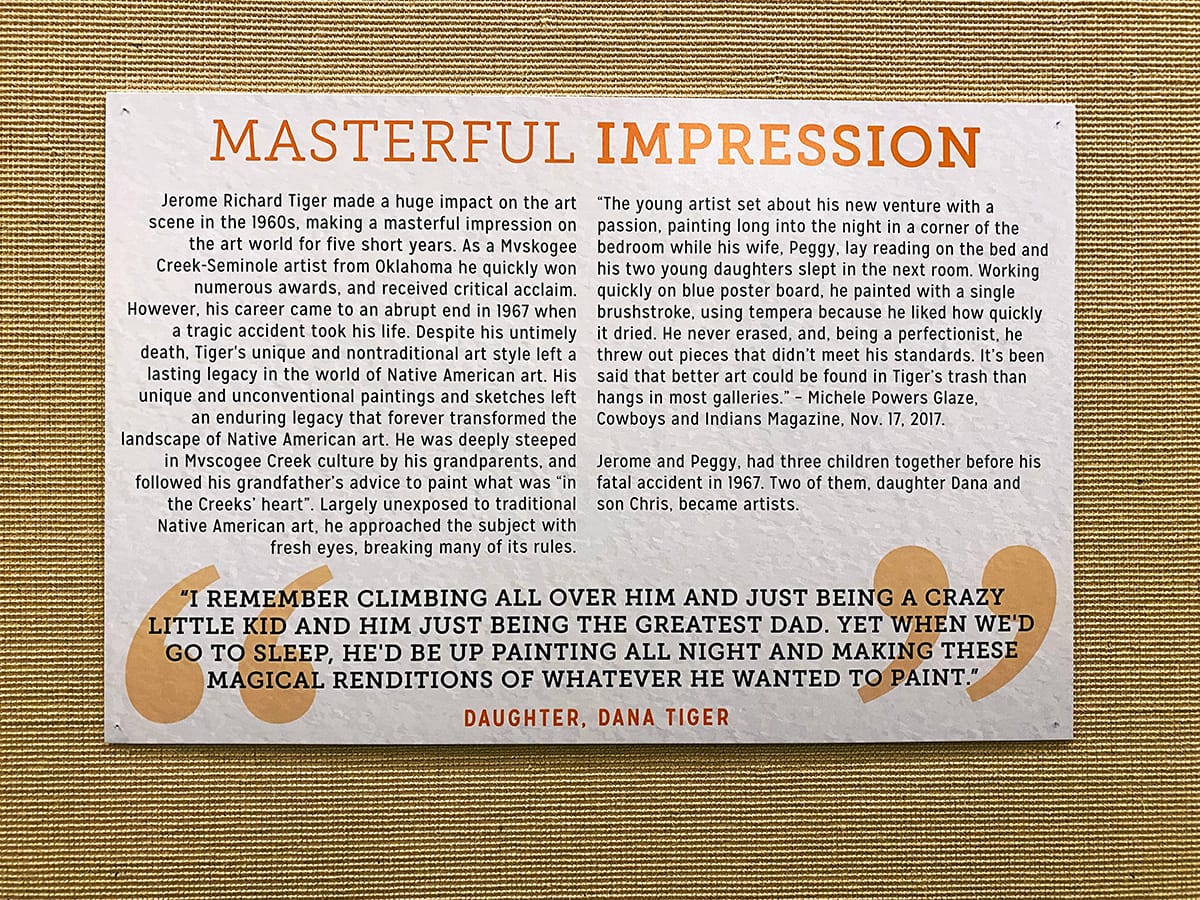 The first thing that struck me about the Jerome Richard Tiger exhibition at the Mid-America All-Indian Museum was the need to walk closer.