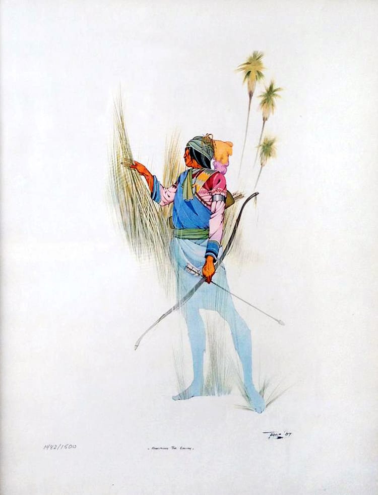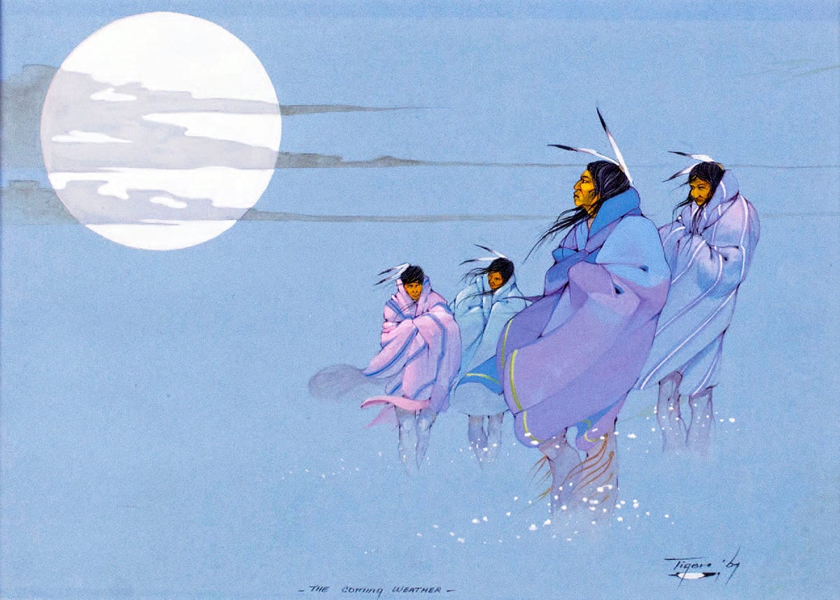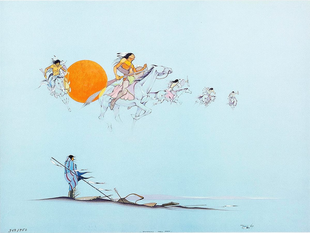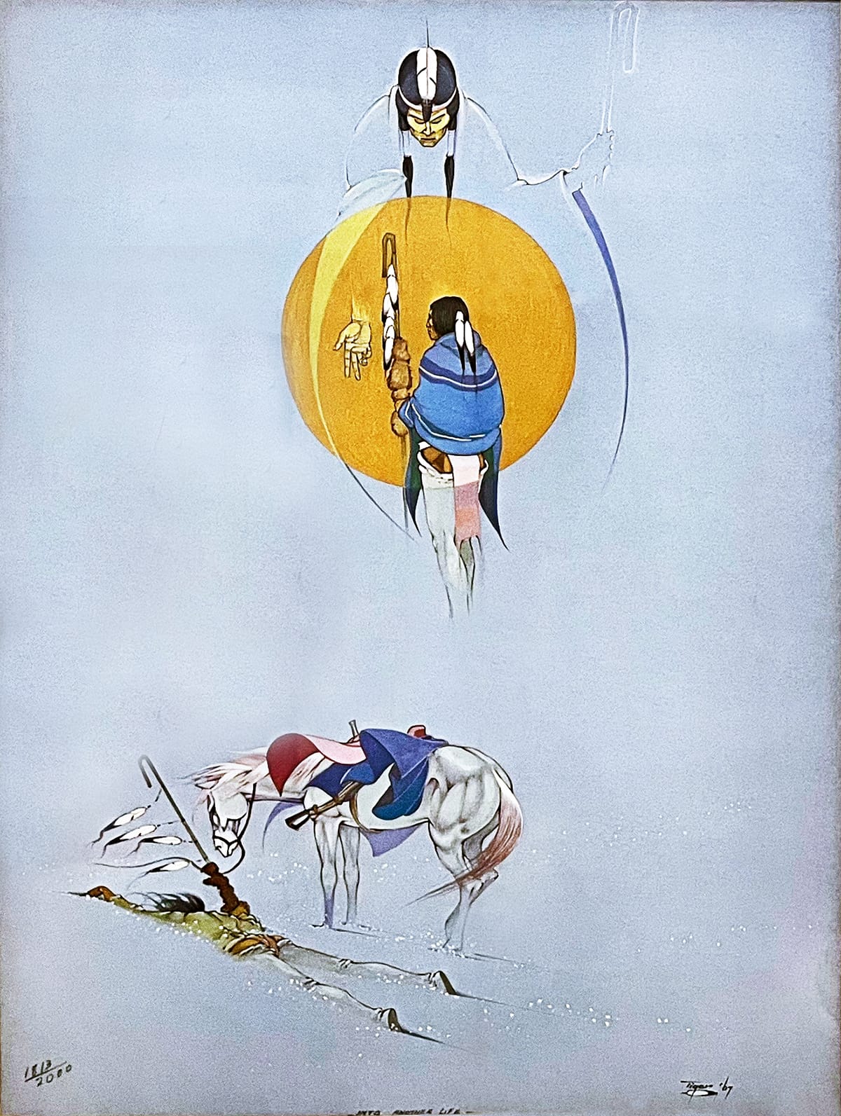 His career lasted only five years, but in that time Jerome Tiger became quite popular and produced a large amount of work. According to the Oklahoma Historical Society website, during one eventful show at the Philbrook Art Museum, he was said to have replaced paintings that sold out at least twice. At age 26, he lost his life in a tragic firearm accident.