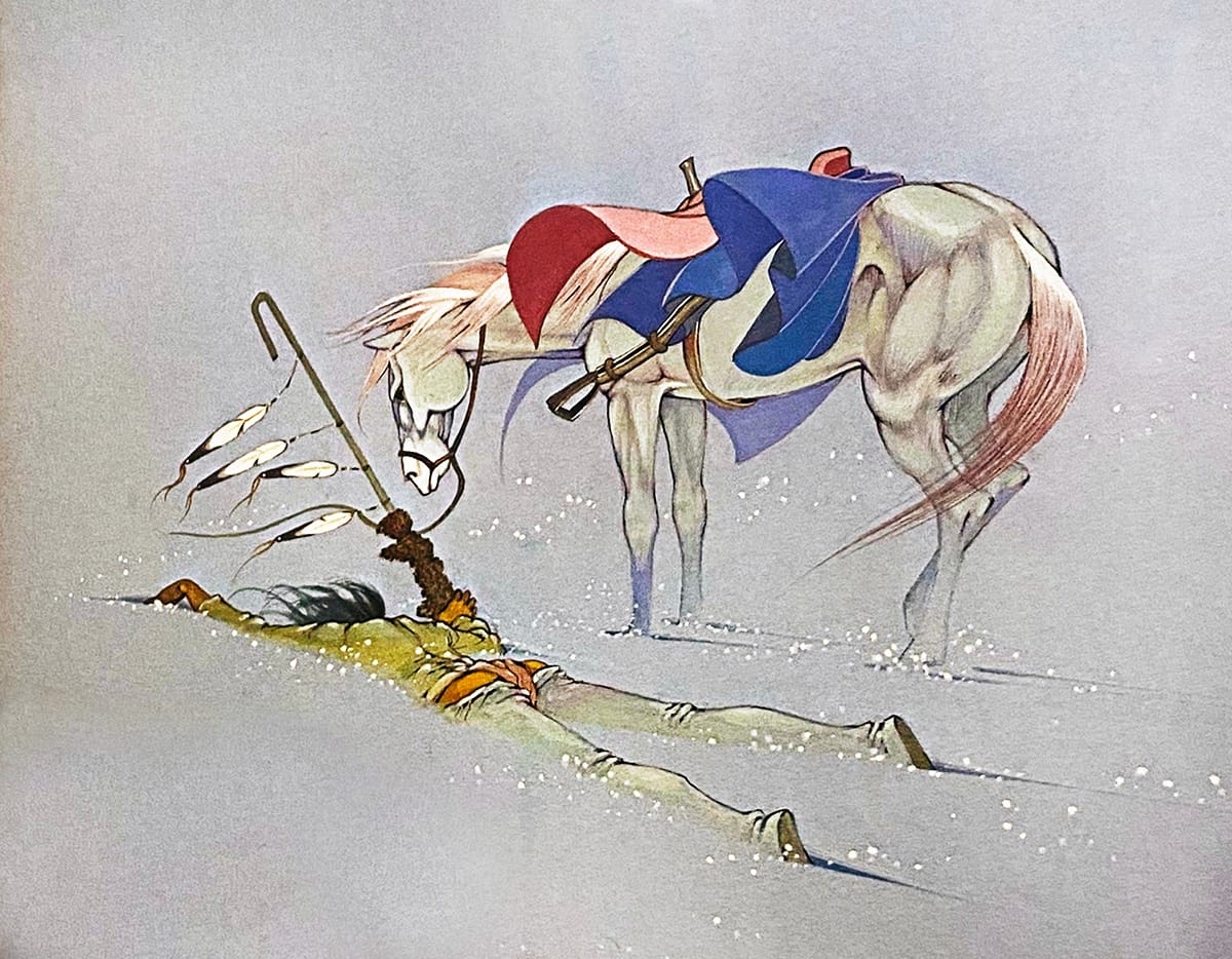 This very topic is the subject of “Into Another Life,” which shows a man lying dead in the snow next to his horse near the bottom of the painting, and the same man being guided away by an ethereal figure. The snow, the horse, and the guide are precise but bare outlines, already fading away at the edges, while the man is clearly detailed and distinct. The emphasis is on the permanence of the self as opposed to the material world.