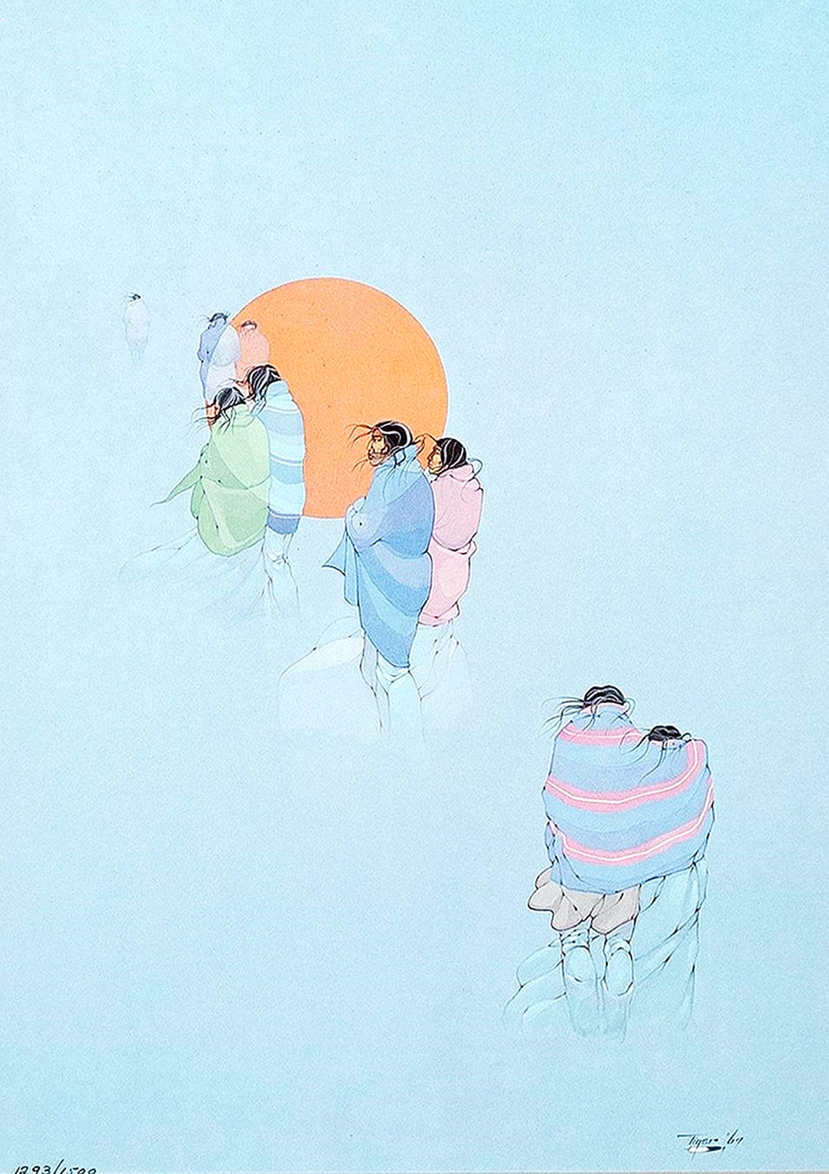 Perhaps this fact is reflected in the poignancy of his work, which often tiptoes between this life and the next. In the print “A Walk Through Great Mysteries,” nine figures are moving away from the viewer while a red sun hangs low in the sky. The figures, huddled in blankets and walking in groups, move through the piece at a diagonal, following an invisible trail up past the sun and growing fainter as they do so.