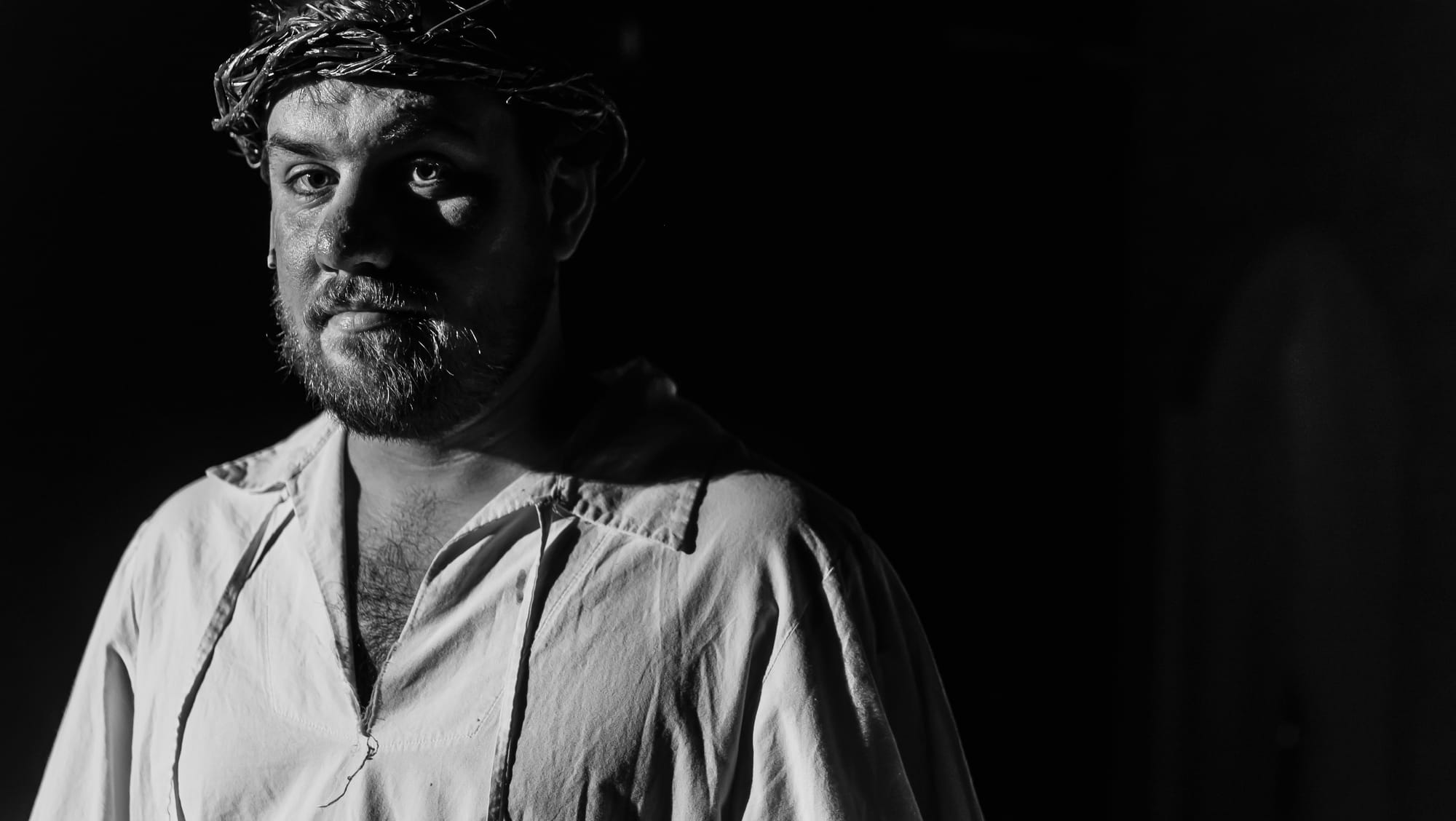 Huffman is also responsible for scene design. He has crafted an open space that evokes a little church pageant and a little passion play. A wall constructed in real time is decorated in a way that might represent an Orthodox icon or a shroud. It is a captivating detail. The set comes alive at one point, closing in on a trapped Jesus.