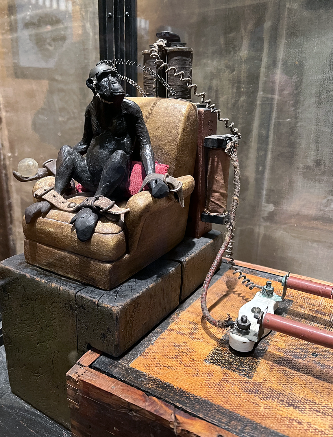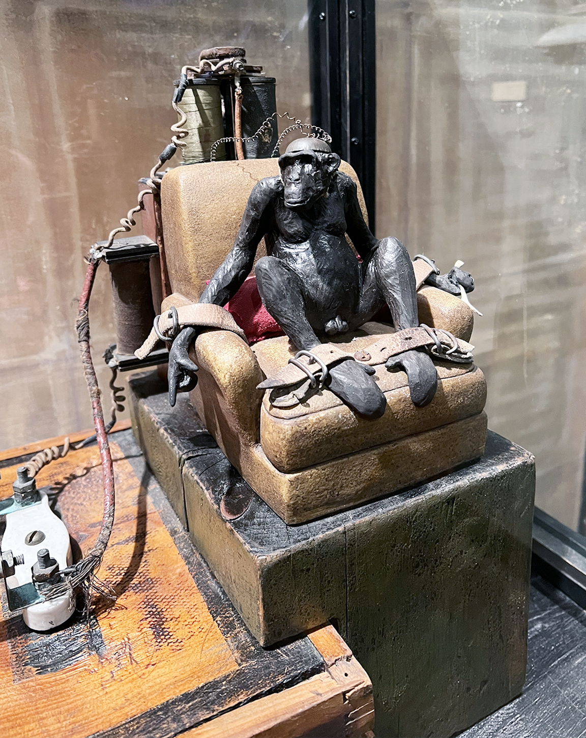 She takes the time to identify and research the objects she finds. Once, she says, she found a bone that turned out to be “a whalebone specific to a blue whale, a bone that hangs below the vertebrae of the tail, and that’s special because on both sides of this bone, there are two floater bones — remnants of what was a pelvis from a time when whales had legs. Every object has this kind of information and that’s what gives me the start of an idea. The chimp just becomes my vehicle to talk about that — those layers upon layers of meaning that are there.”